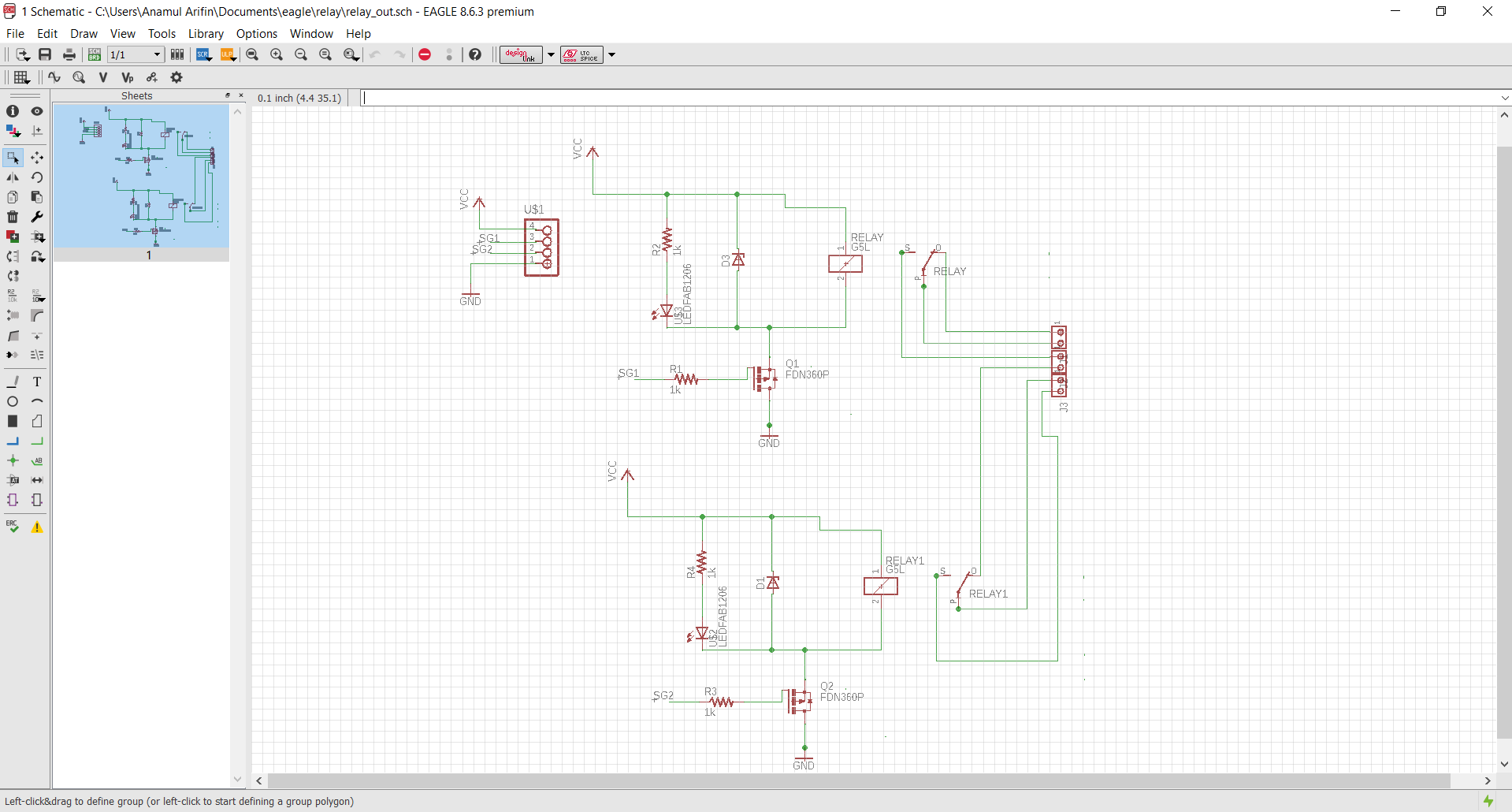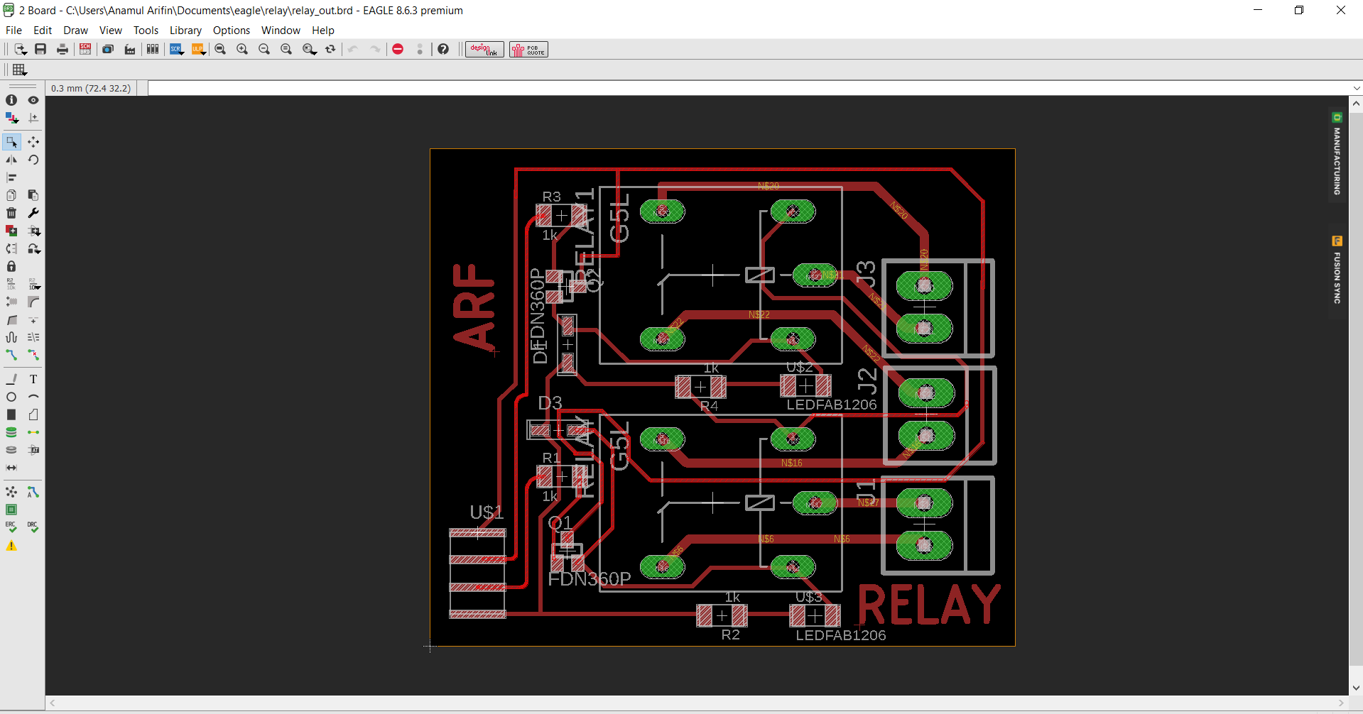 1. Schematic: After reading and datasheet and talked with my instructor, I designed board schematic with follow th library.This is the 2-channel relay module