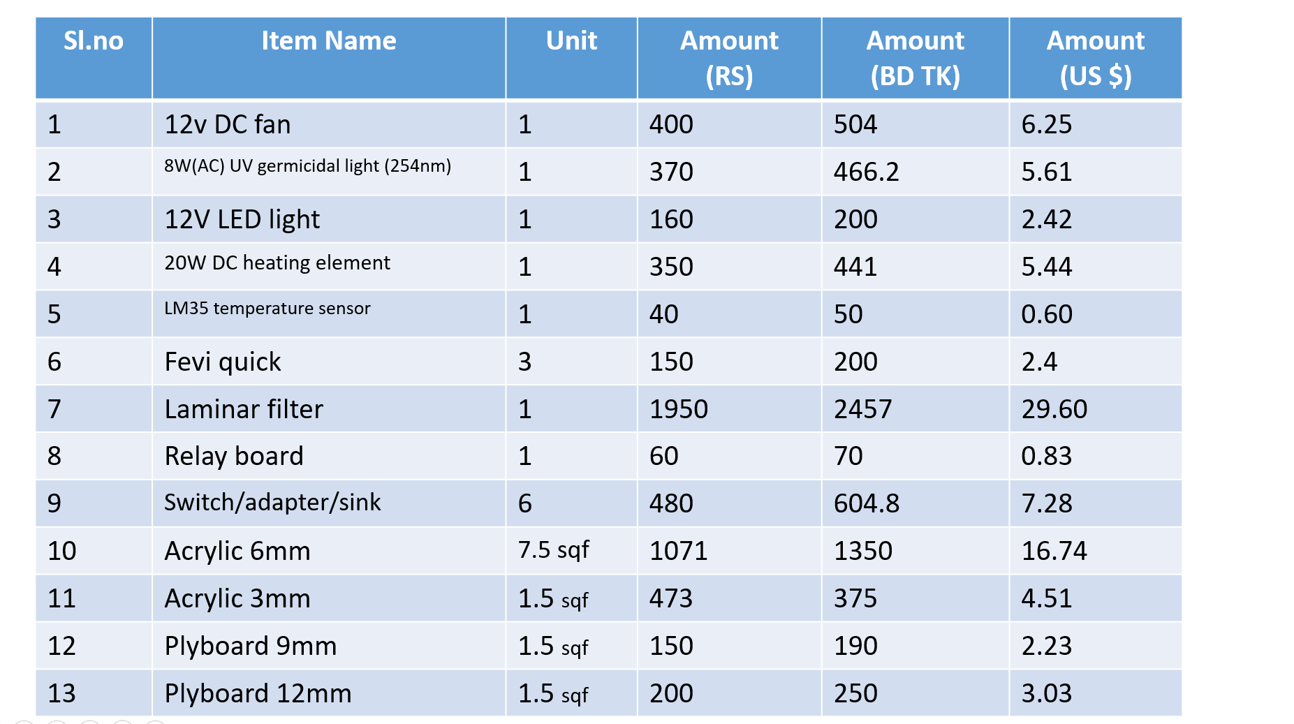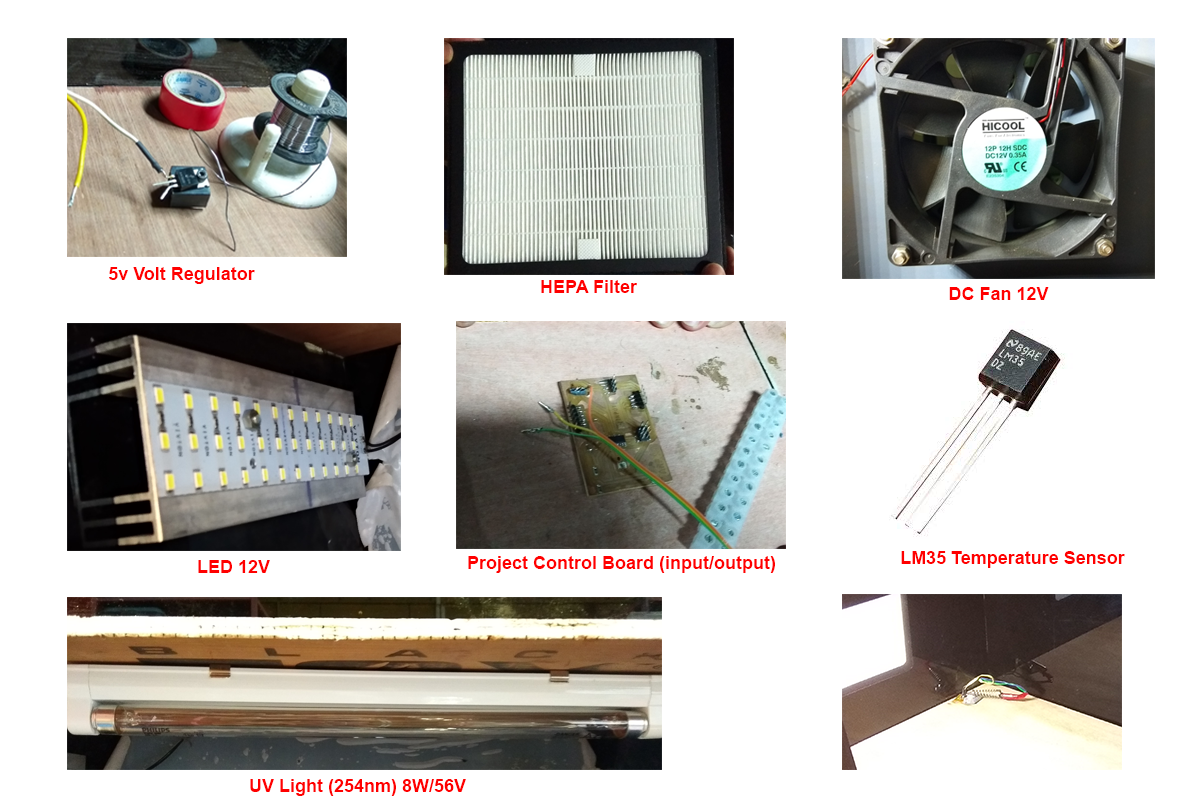 For my project most of the component come from local market, the acrylic sheet, plyboard, UV light, led light, dc fan, lm35 sensor, heating coil, relay board all are collect from the local market. Hinge for front door I will make by 3D printer. Some clamp for fixing the back door I will make it by acrylic.