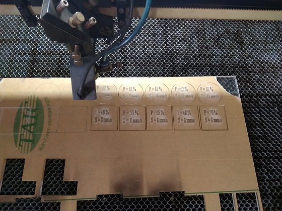 Acrylic 6mm: we made two patterns one with varying speed, another is different speed. The first pattern was having a constant power of 62% and speed ranging between 8 to 12. other has speed of 8 and the power ranging between 55% to 70% For this speed 8 and power at 68% is best result that was we found with the least kerf of 0.3mm.