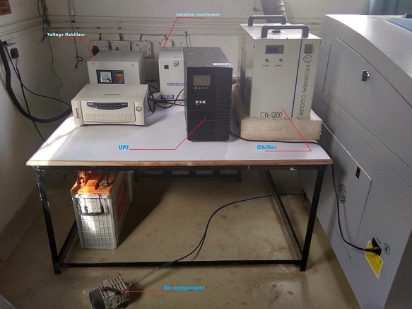 The machine works on a standard single phase AC supply of 230-240V there have been a special setup made of electric components, for fluctuating the electrical volts it needed the stabilizer and for backup power it has connected with on line UPS. (Images are in the below:)