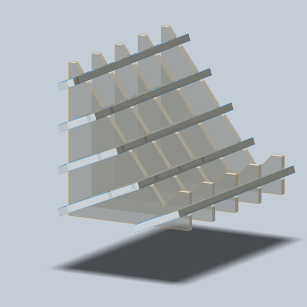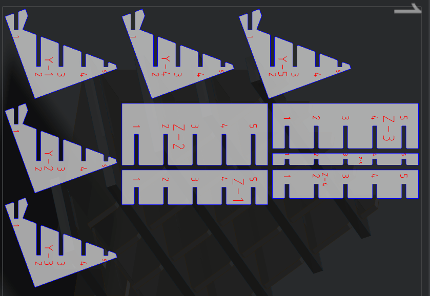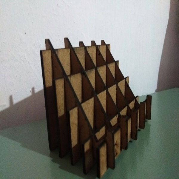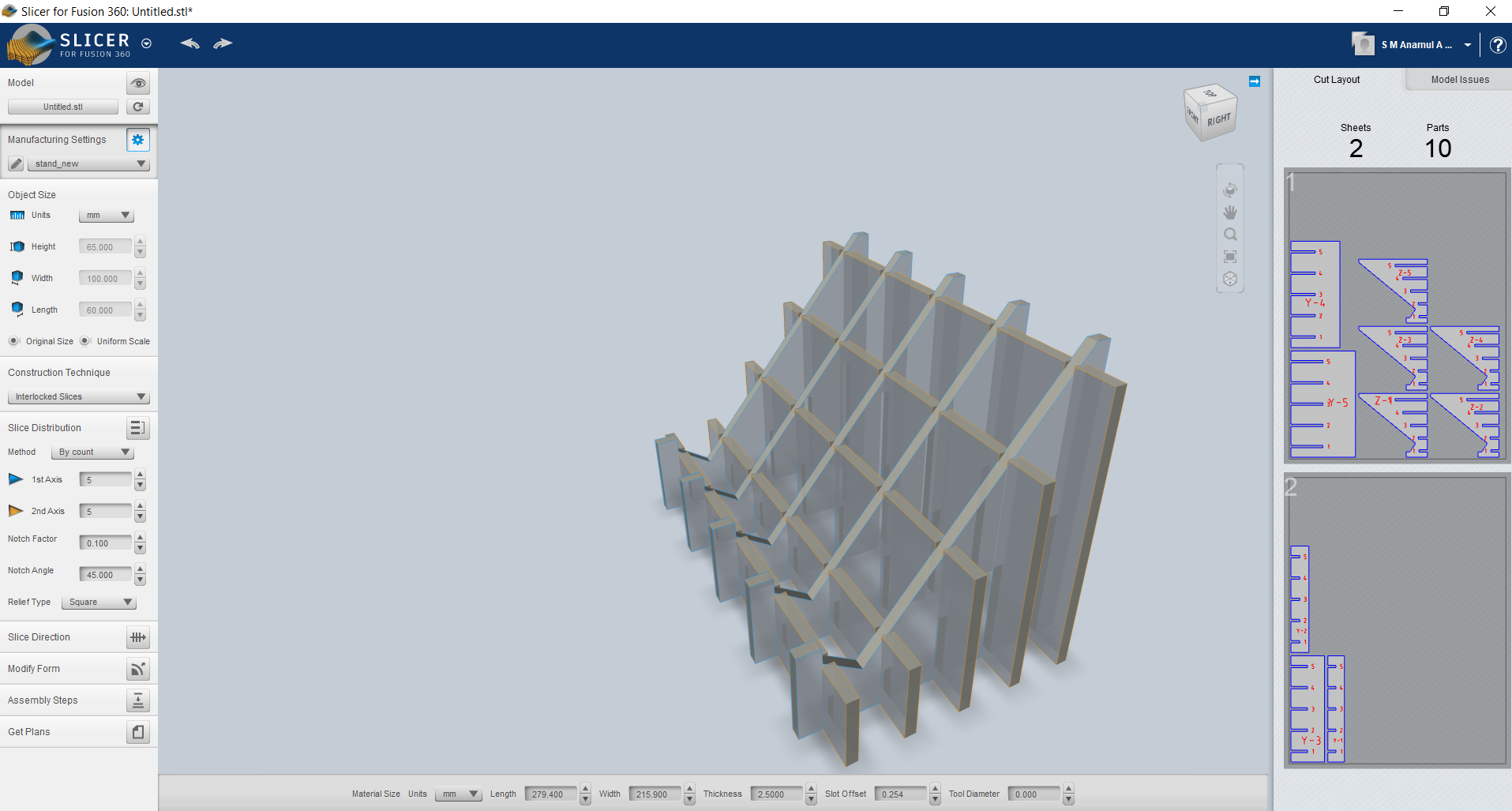 In slicer here the parameter are: a. Construction Technique: Interlocked slices; b.Slice Distribution: Method-By Count 5/5; Notch factor:-0.1; Notch Angle:45, Relief Type: Square. Thickness: 2.50mm, Slot offset: 0.254mm