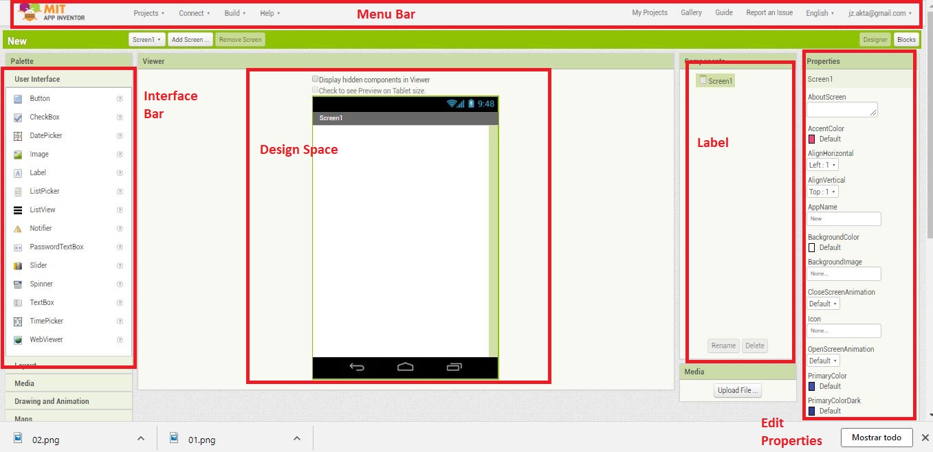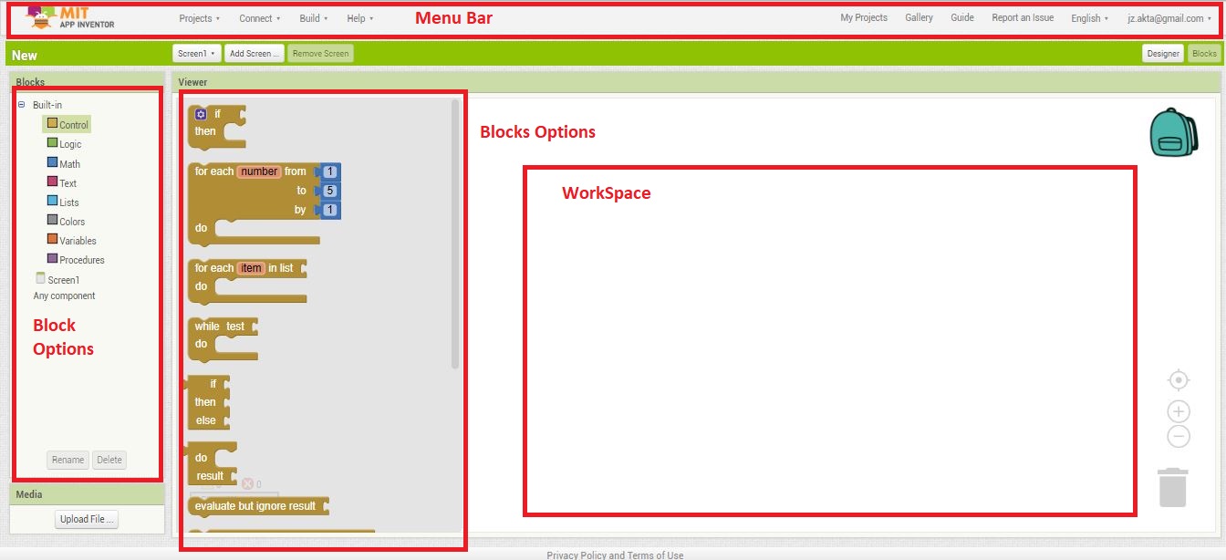 First, to start with the application is important to go to this link, you can access with a google account, once inside the program create a new project, then you have the following workspaces to start designing the app: