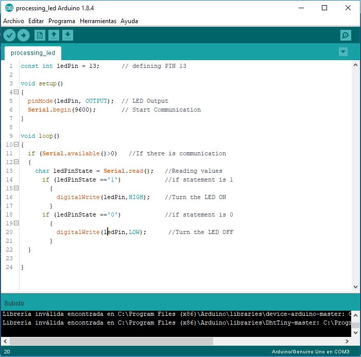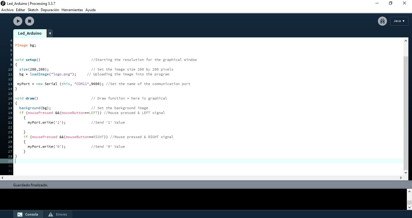 Then I made an application that links a simple programming of processing with an arduino sketch for the control of an LED, the communication will be made by the Serial port of Processing and Arduino IDE.