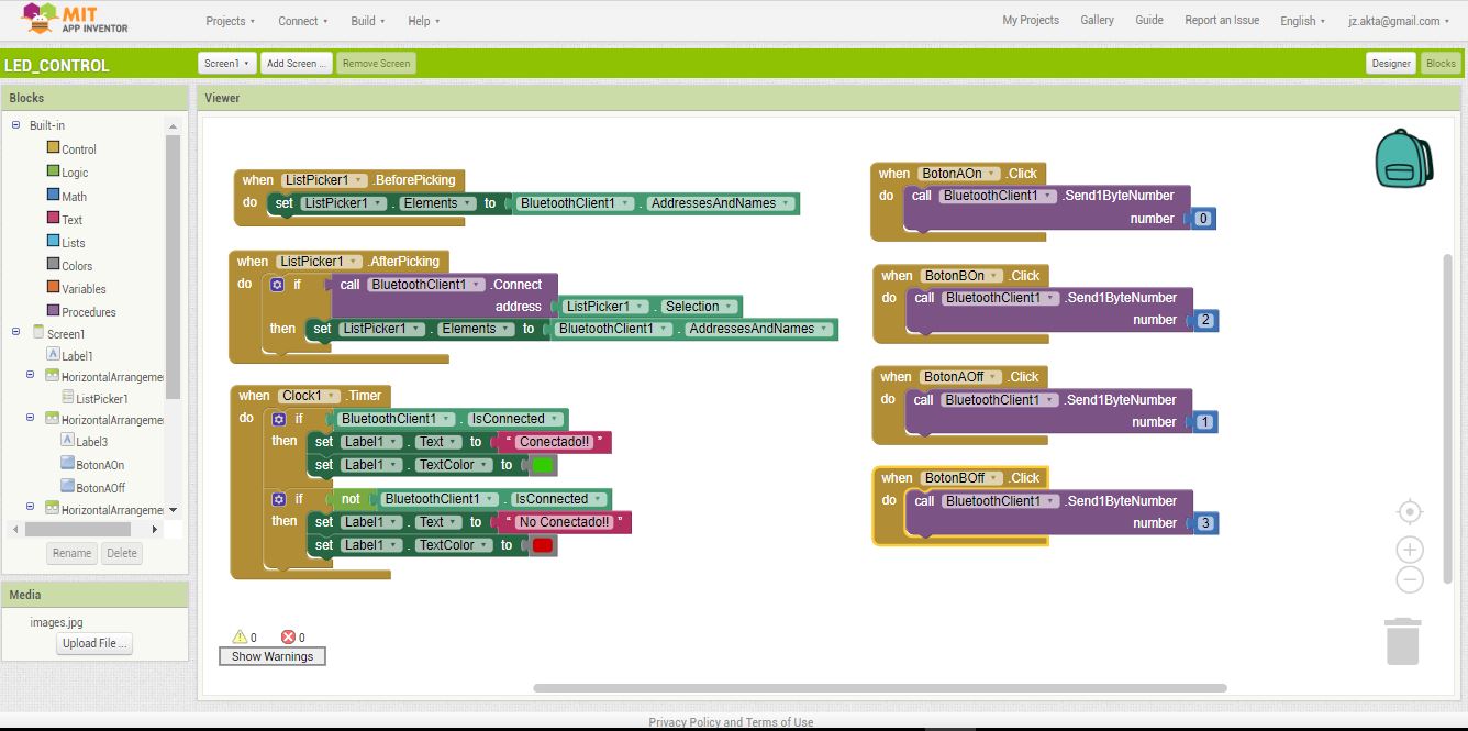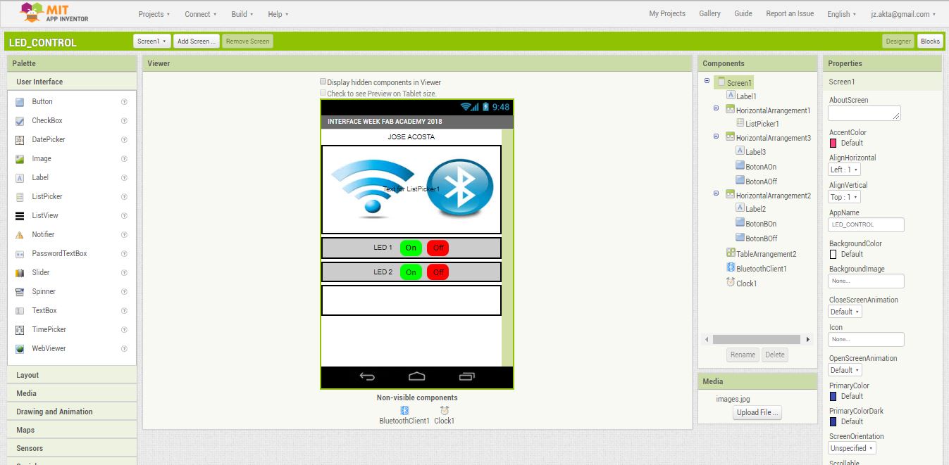 Continuing with the development of the activity, then I show you the process of developing the visual interface in the application for the control of LEDs using my experimental board FabChay Board.