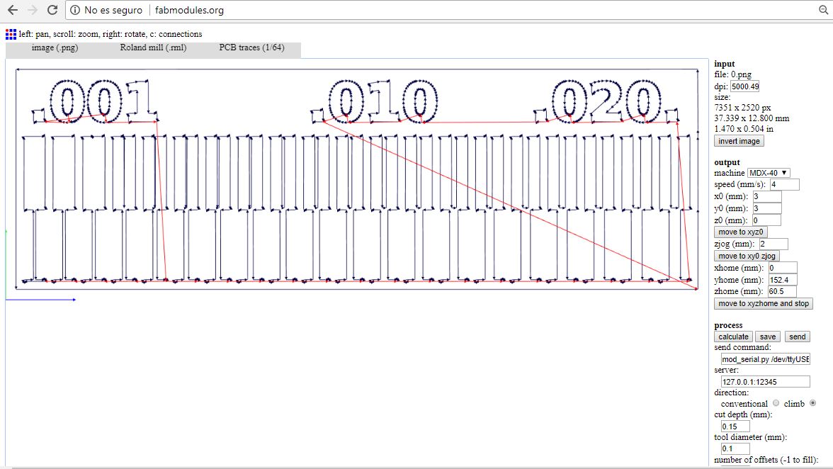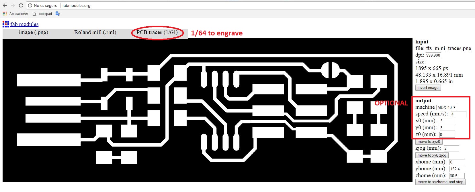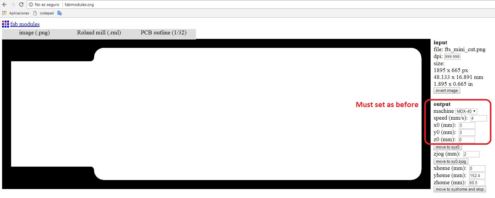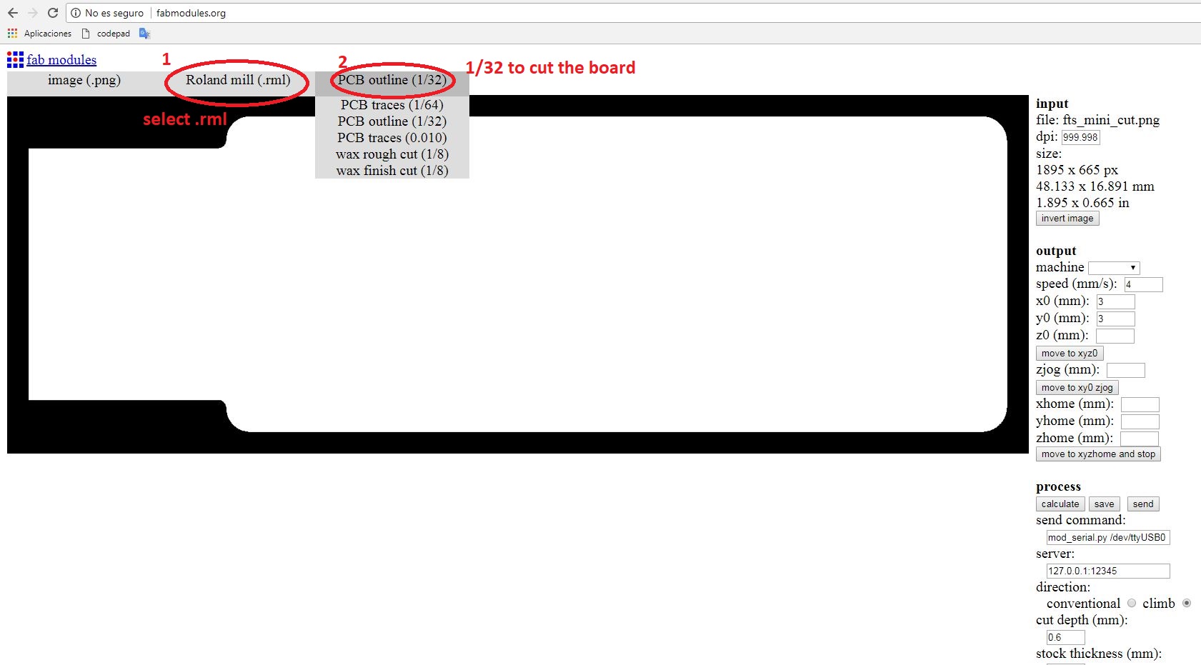 Now we are going to carry out the same activity but to cut the electronic board, we must configure the milling tip to 1/32 ", in the fabmodules webpage we will perform the same previous activity but we will select the following parameters that are shown below.