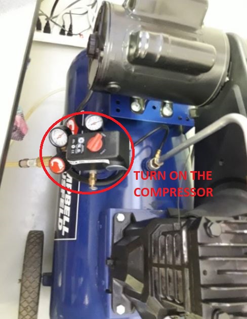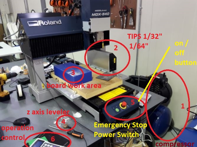 The machine that I will use for this activity is the Roland MDX-540 milling machine, with interchangeable tips, we start turning on the air compressor because the machine has pneumatic drive for the change of router bits and for the movement and the milling of electronic boards or figures in 3D using blue wax.