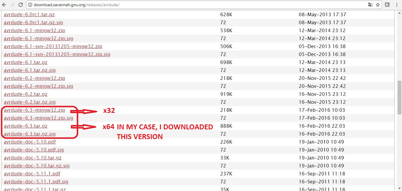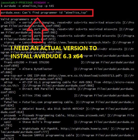 Second problem, AVRDUDE in the followed tutorial are not compatible with my system, i need to find an actual version of AVRDUDE, for example AVRDUDE 6.3 x64