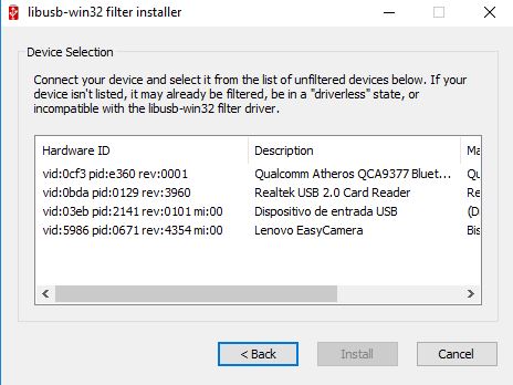 Then I recommedn to install ths software libusb-win32, this software will instal all the drivers I need.Follow this process: