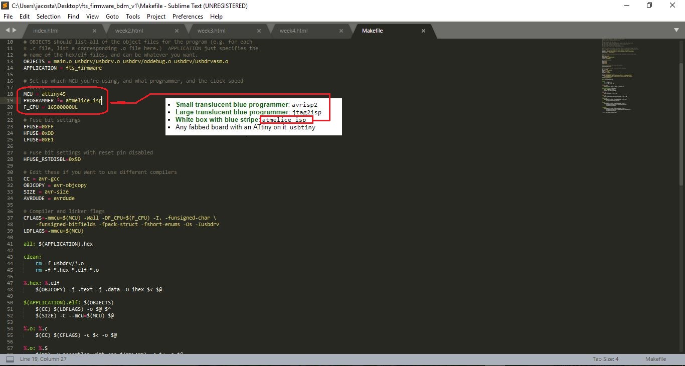 Now, I´m going to download the firmware here I need to change some parameters in makefile, to do this Í'll use Sublime text.