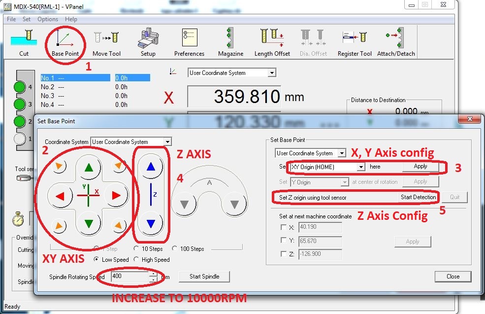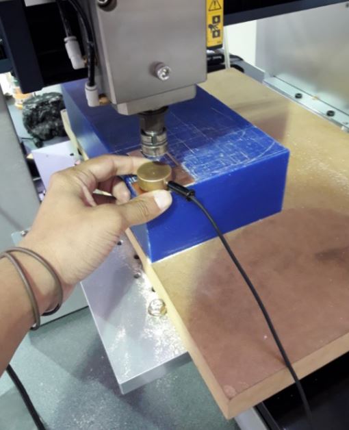 To assign the coordinates origins, we will use the scroll buttons on the X and Y axes, manually locating the location that matches the copper board, then press the "Apply" button. Next to calibrate the Z axis, it is important to place the sensor on the height below the head (verify that the sensor is correctly connected to the machine), then press the "Start Detection" button, the tip of the head will touch the sensor and the system It will calibrate the height, it is important that the surface of the copper board is clean and totally flat.