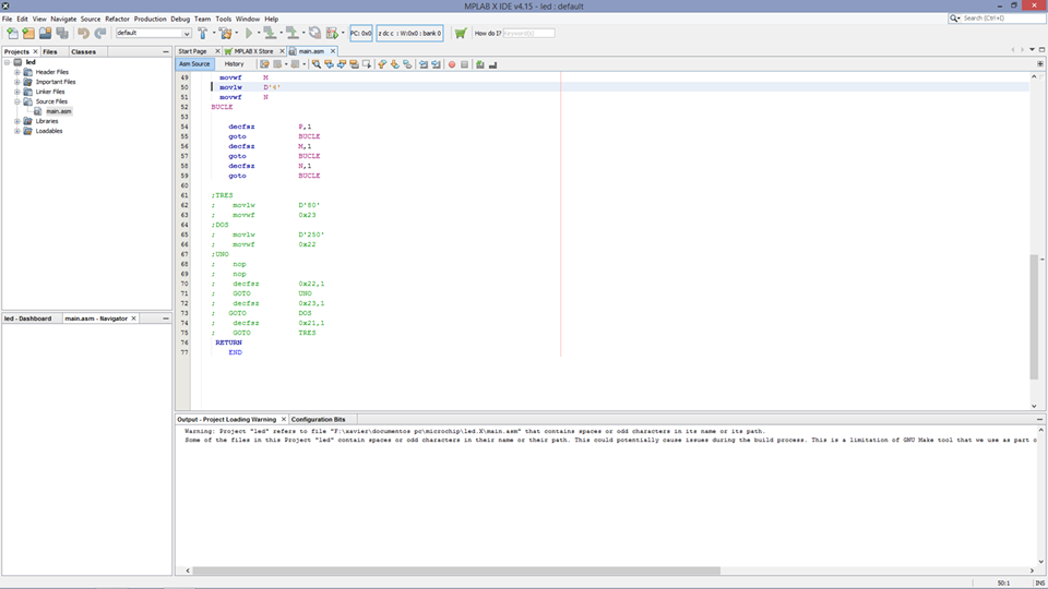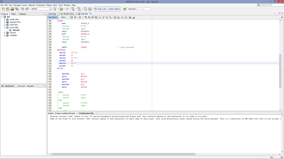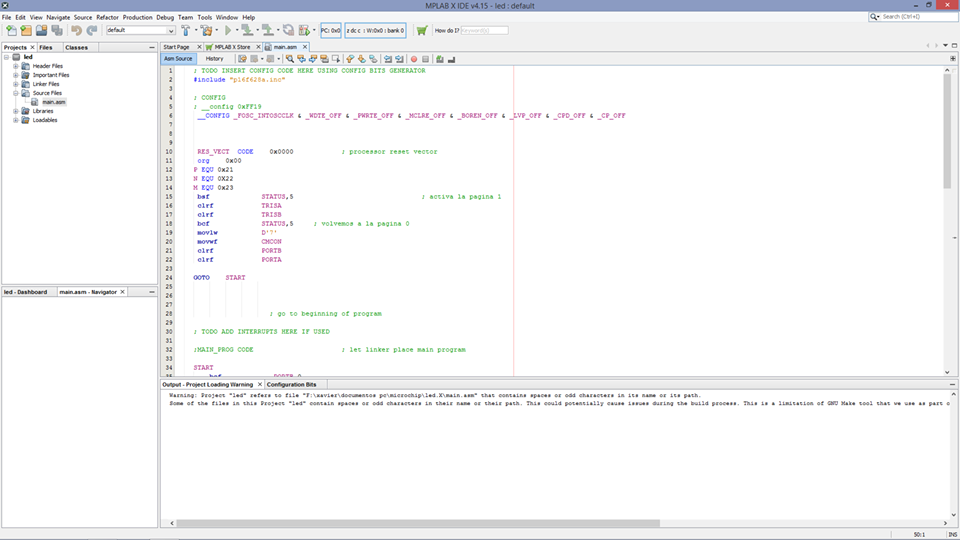 The present exercise is a blink with a red led, programmed in assembly language and simulated in proteus, when working with PIC microcontrollers we are using the Harvard architecture.