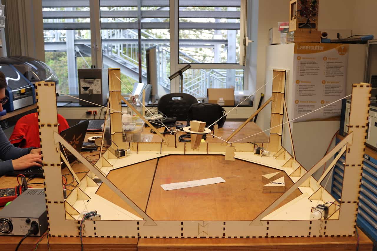 As the base on which everything sits the frame is as important as the other parts. The requirements were to make it in the lab. Also, the frame should be sturdy and rigid, so that it does not wobble and move around when the ring is pulled somewhere. At last the frame should be quite big but small at the same time. It should span a wide area but consist of small parts so that you can see where you need to throw and that it doesn't block everything. It turned out really good and if you want to know more, check out Leon's documentation on how he designed and created the frame and what problems arose during it. He also designed the winches.