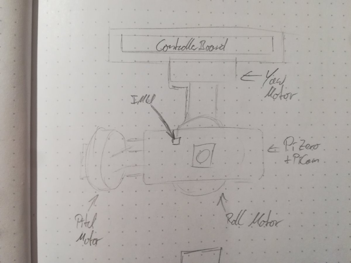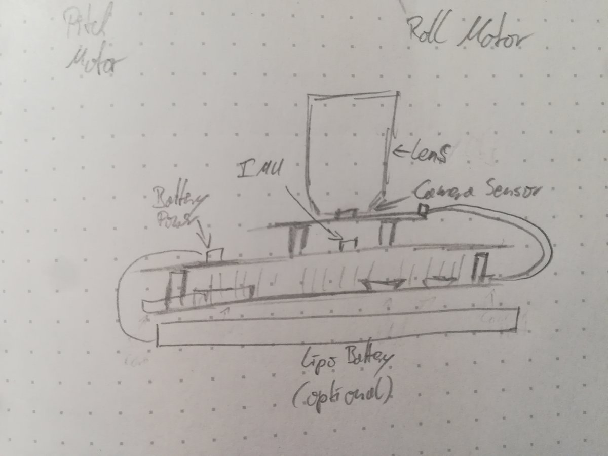 The following sketches illustrate my ideas on the overall design. First, the general principle: three motors with orthogonal turning axes manipulate the orientation of the camera, whose center of gravity has to be located at the intersection of the axes. Then, the frame. In its simplest form, has a containment for the main board (where e.g. the motor driver ICs and main processor are placed), one arm to pan around, and one arm to alter the pitch of the camera. The Camera is directly attached to the motor controlling the roll axis. Finally, an extension board for the pi houses the inertial measurement unit (IMU), as well as a processor that reads the sensor and power management electronics. The Camera is mounted onto this extension board. Ideally, I would like to include the option to power the pi from a LiPo battery attached to the back instead of running a cable from the main board to the extension board.