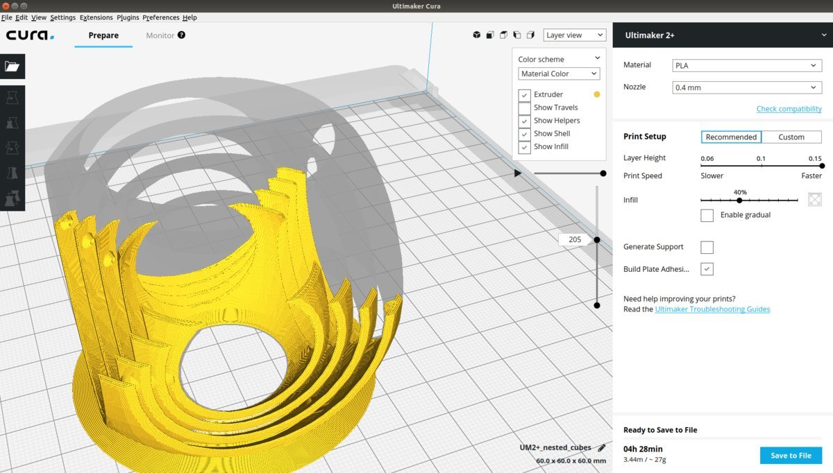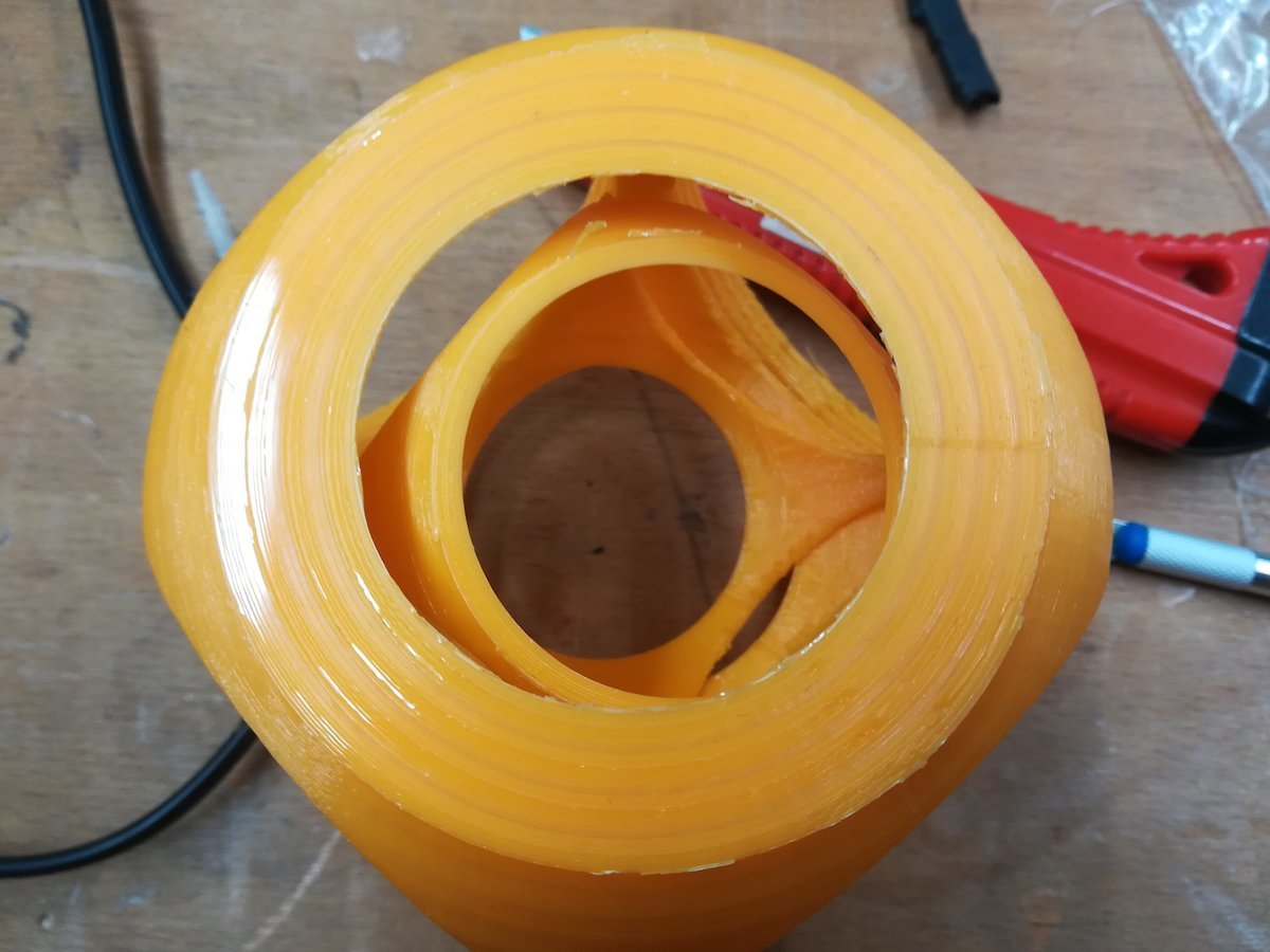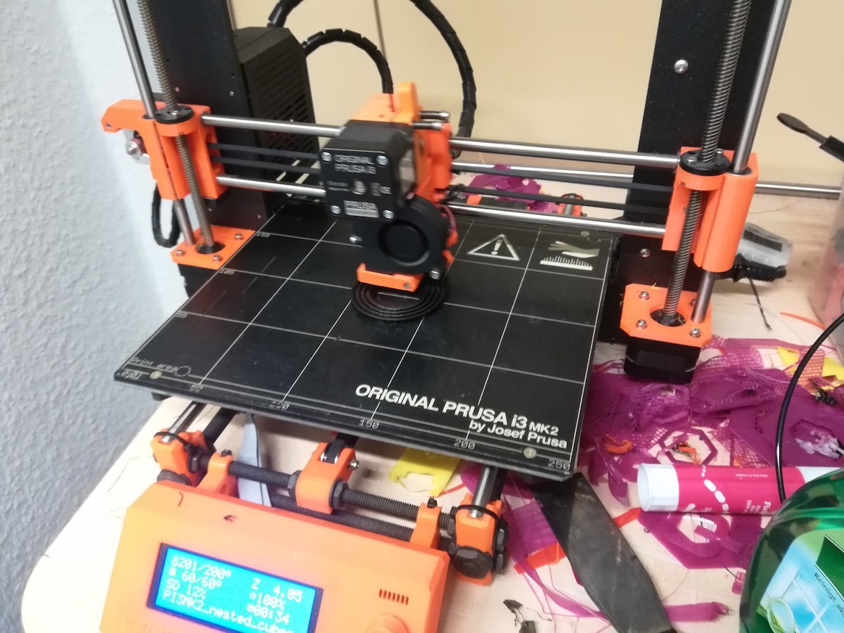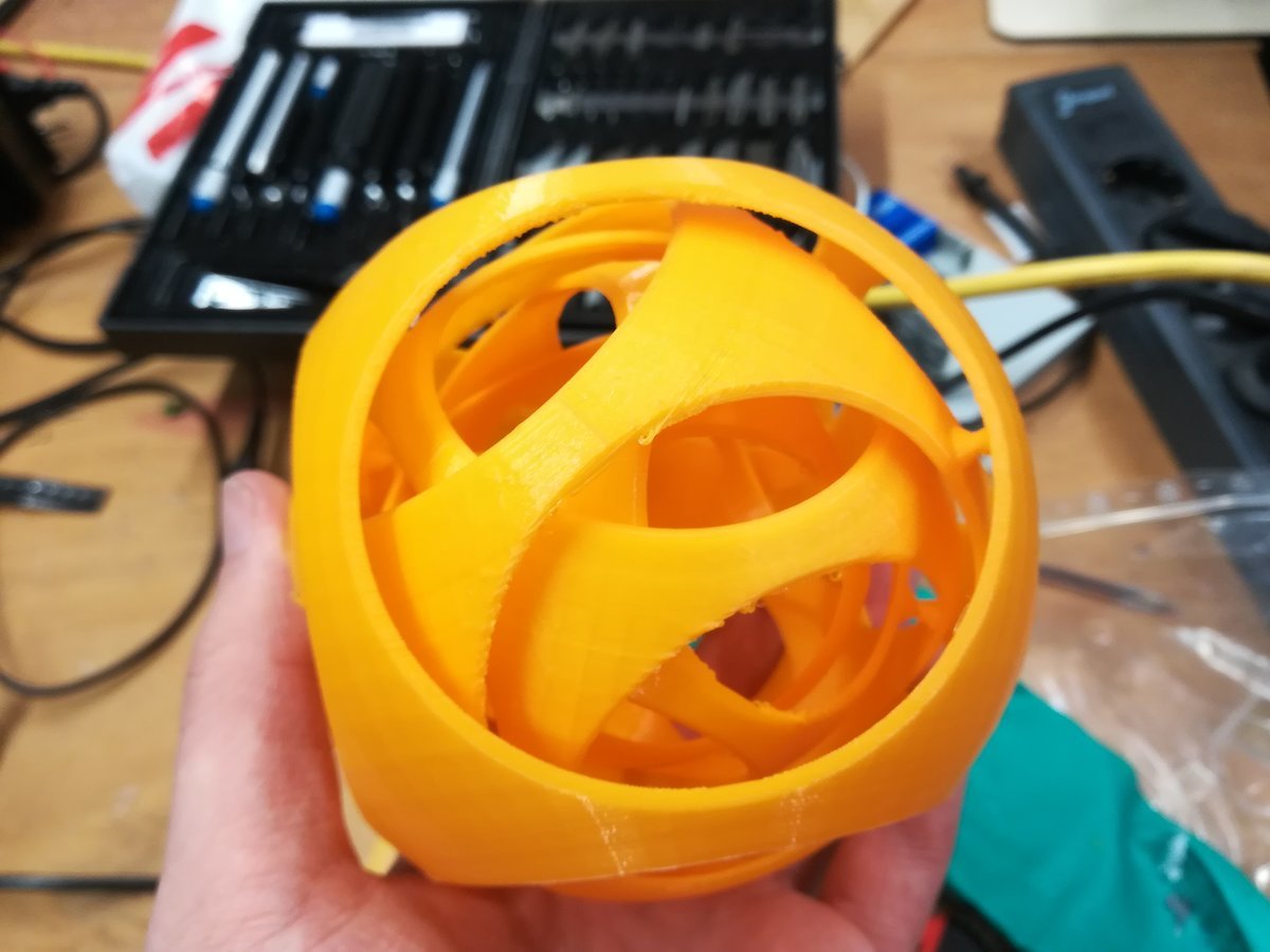 One of our objectives for this week was to use the 3D printer to create something that cannot be made substractively. I wanted to make nested gyroscope similar to this one, but smaller. This cannot be made substractively, because the tool would have to be bent to carve out the round nested structures. So I made my own parametric design with OpenSCAD. From OpenSCAD, I export it as *.stl file. Then, I made use of Cura, an excellent open-source slicing application, to prepare the design for printing. At first, I printed the cubes on a Prusa i3 MK2; however, the print was faulty and did not finish, altough I don't know exactly what problem occured. However, I noticed that part of the joints between the cubes were to small, and could fix the design before the next try. This time, I used an Ultimaker 2+ Extended, and it printed without problems. Apart from the printer itself, the settings stayed the same: 0.1mm layer height, 20% infill, PLA, 0.4mm nozzle. After the print, I had to manually cut the cubes apart, because the printer added a plate at the bottom. But then I finally had my gyroscope!