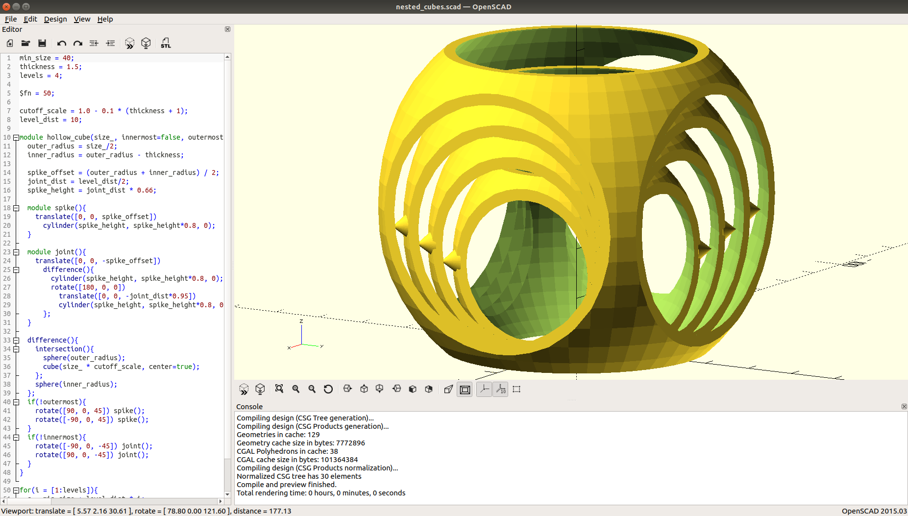 The code defines modules for spikes, joints, and cube parts, which are scaled and nested into each other.