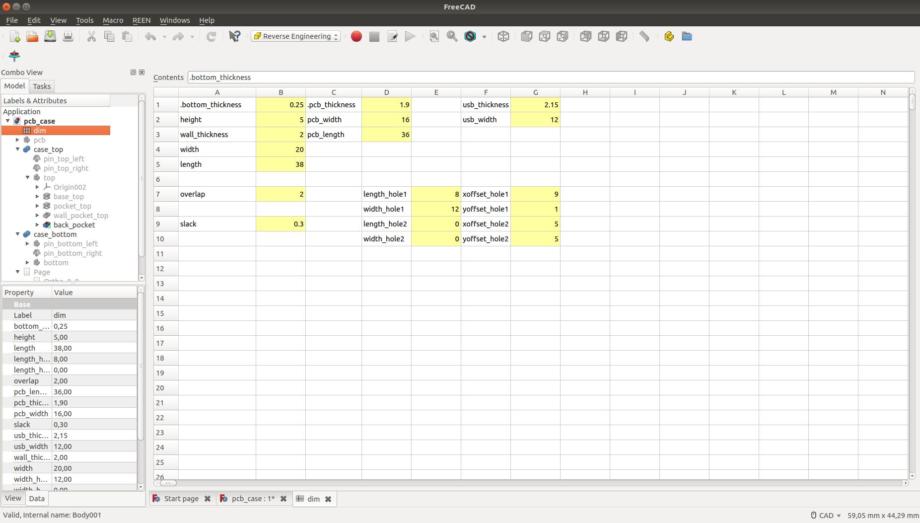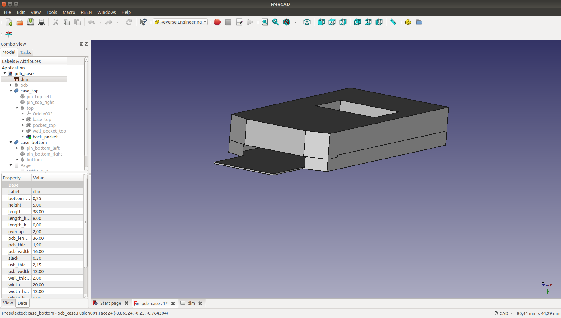 The case consists of an upper part and a bottom part, which were created with the "part design workbench". FreeCad has lots of different workbenches, each containing a somehow coherent collection of tools, for different purposes. Most often I used the part workbench (provides geometric primitives and boolean operations between objects), part design workbench (design a nontrivial part by extruding sketches, making pockets, holes, etc.), and the sketching workbench (construct 2D sketches with geometric constraints).