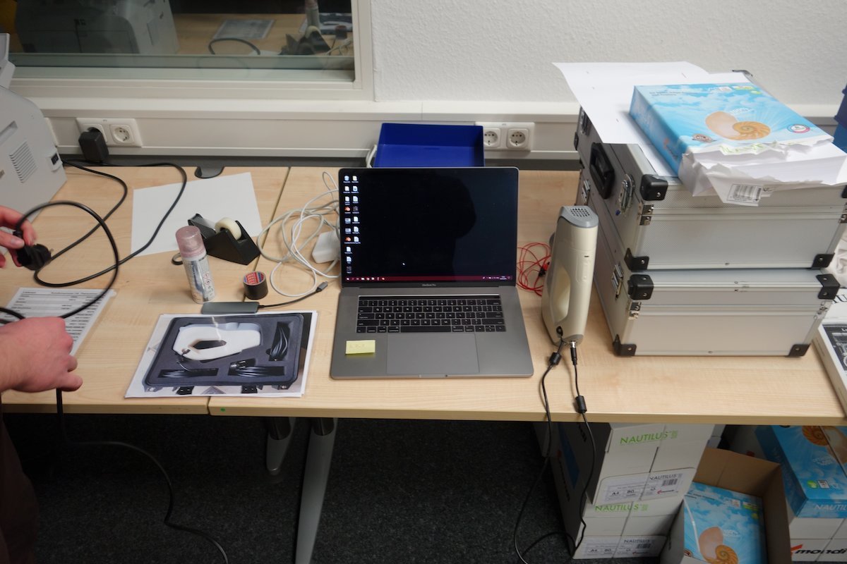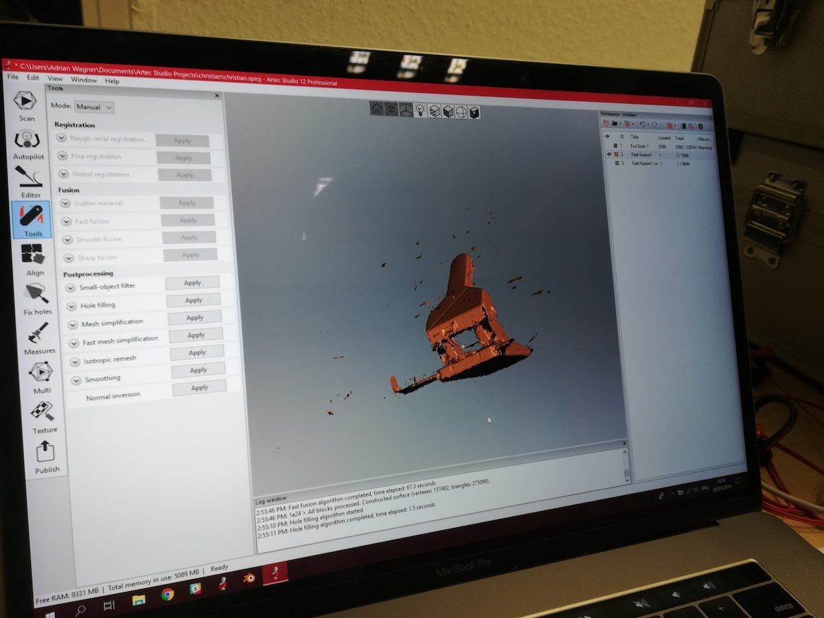 In our lab, we have a 3D scanner from Artec, in particular an Artec Eva. I thought it would be a static machine, suitable to scan small to maybe medium sized objects - I was wrong. The scanner is neither suited to scan small objects, nor is it static. It is hand held and can be moved freely to scan even very large objects. The accompanying software combines the scans, and is able to export textured 3D models as *.obj files.