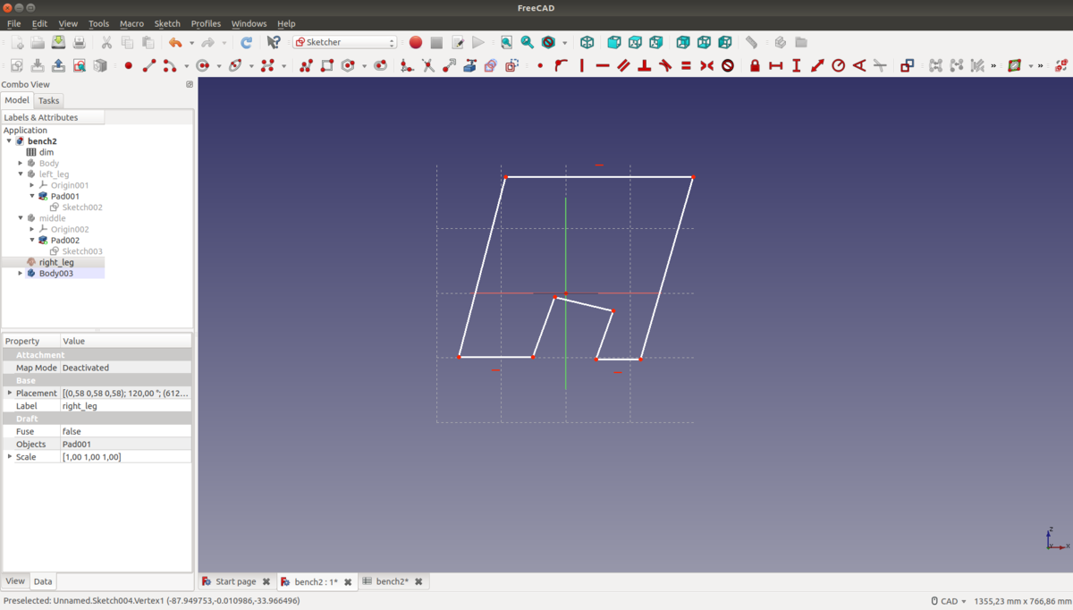 Next, I designed the legs. Again, I created a sketch of their profile and extruded the sketch to form a solid.