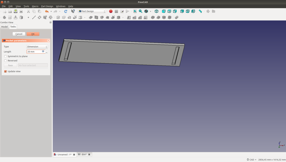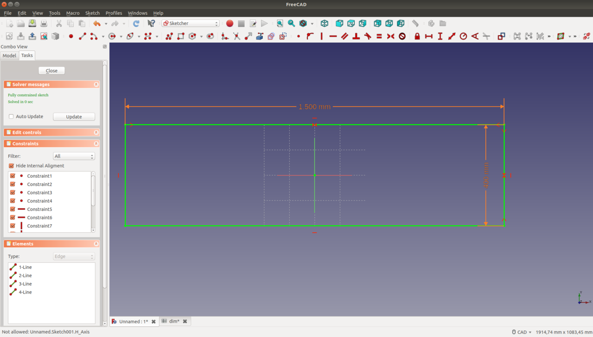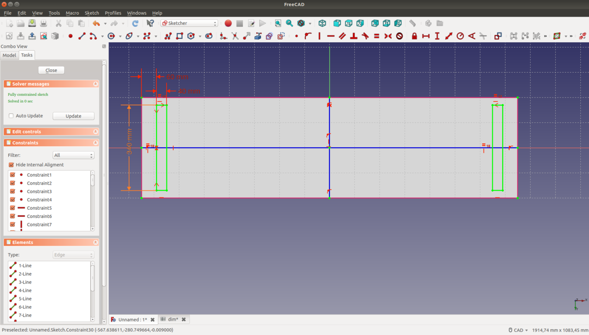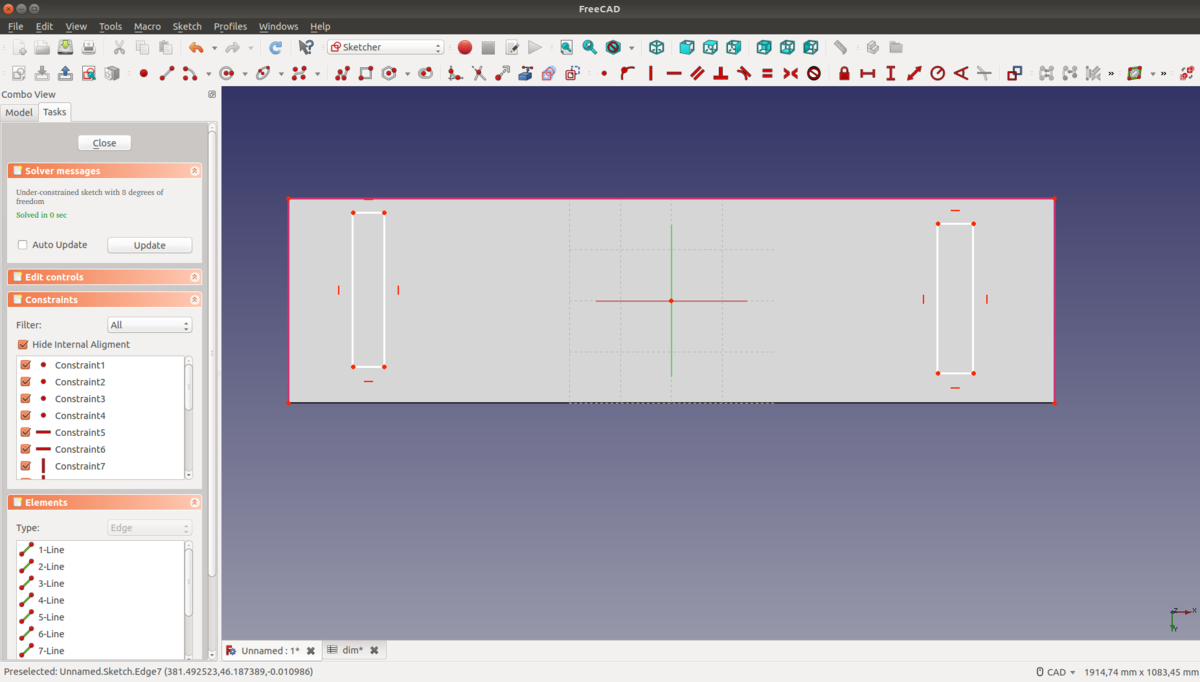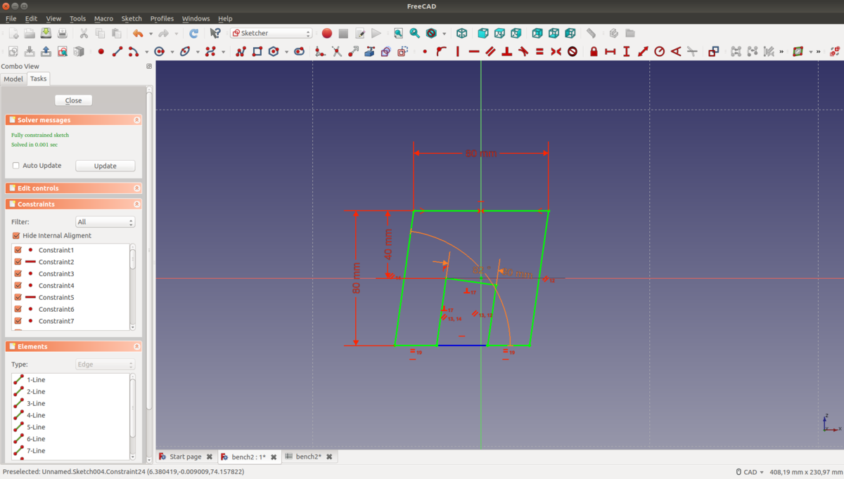I started with the board to sit on. This is basically just a plain rectangle with holes to put the legs into. With the sketch tool, we can create constrained 2D sketches which can be turned into solids afterwards (for example, by raising them out of the sketching layer, rotating them, or subtracting material from the solid beneath them). Constraints enforce specific properties of the objects they are applied on (horizontal or vertical lines, for example). For all numbers that specify some property of an object (or constraint), it is possible to enter a formula instead of a fixed number. Object properties can be referenced in these formulas, making it possible to construct objects with rich parametric interdependencies.