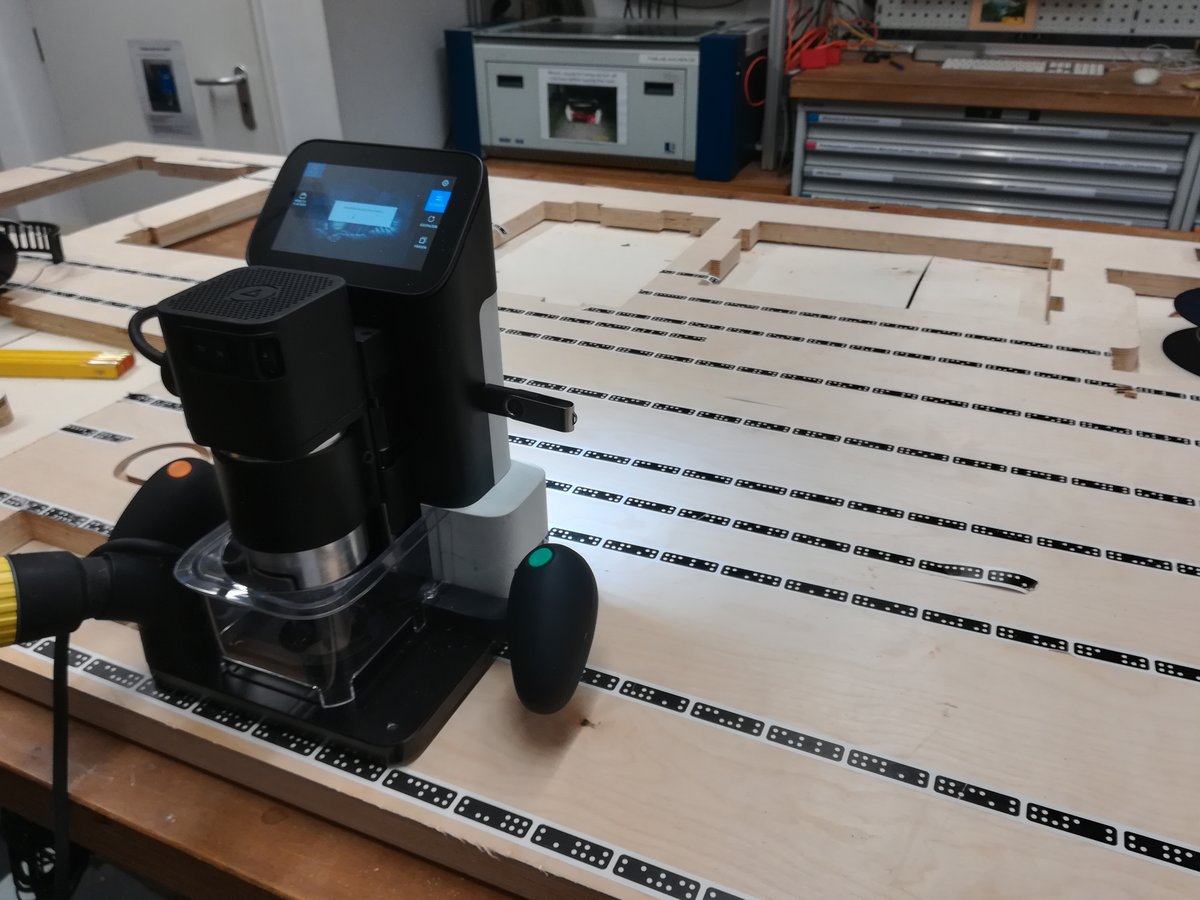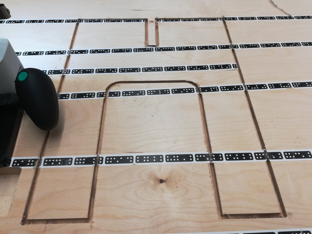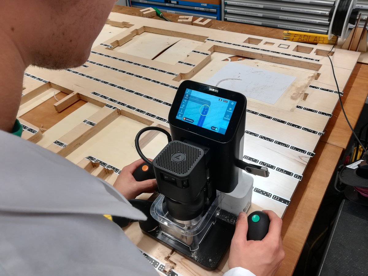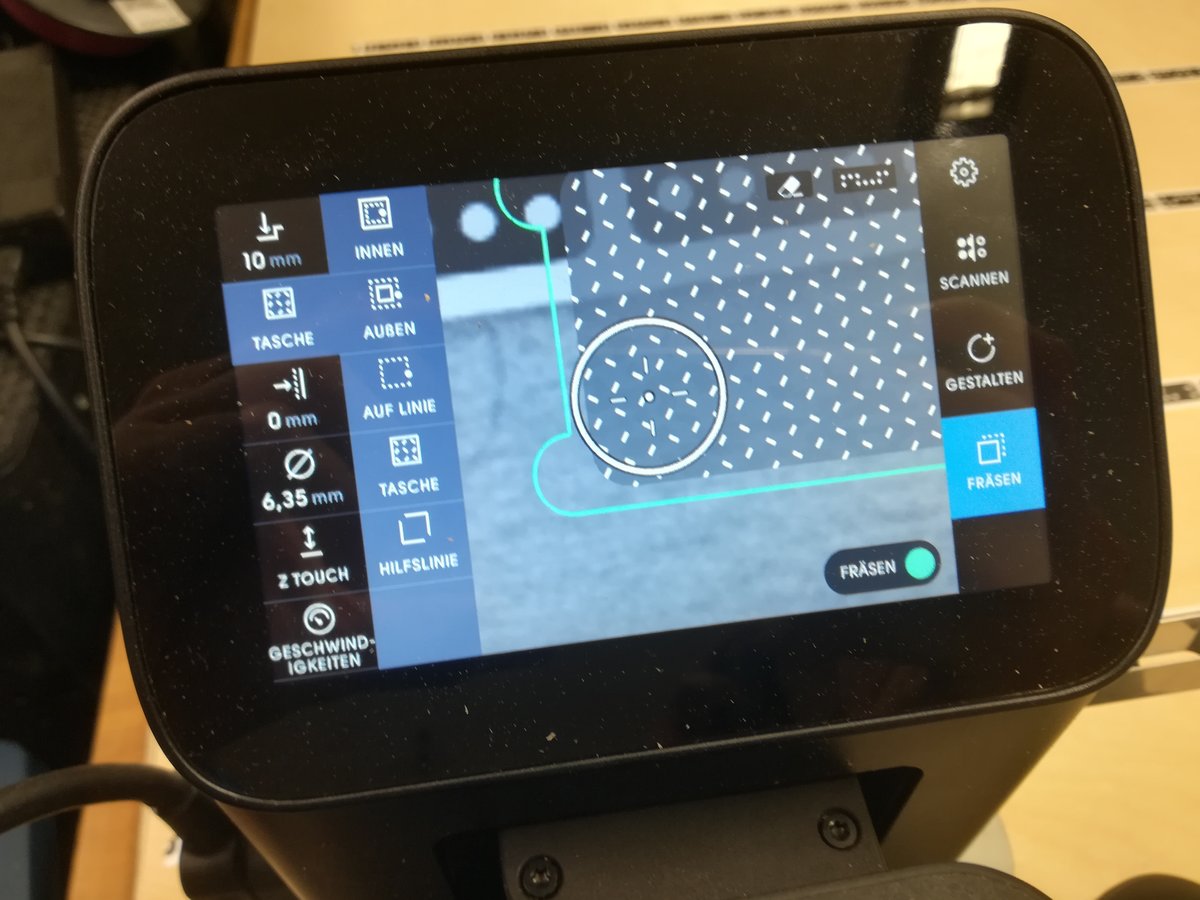 For this assignment, we were able to use a hand held CNC mill. Using tape with special visual markers (called shapertape), the mill is able to locate itself on a plane. As input, it requires a vector graphic of a shape that is to be cut. Parameters like depth and cut type (i.e. whether to cut on the inside, outside of the shape or on the line) can be encoded in the graphic via colors, but can also be set on the machine. The shape is then placed somewhere on the plane and the operator of the machine has to move along the lines; an indication of movement direction is shown on the display. The mill automatically corrects deviations from the path with the moveable drill head. If it detects that it cannot correct some motion, or cannot locate itself due to insufficient visible tape, the drill head is automatically retracted.