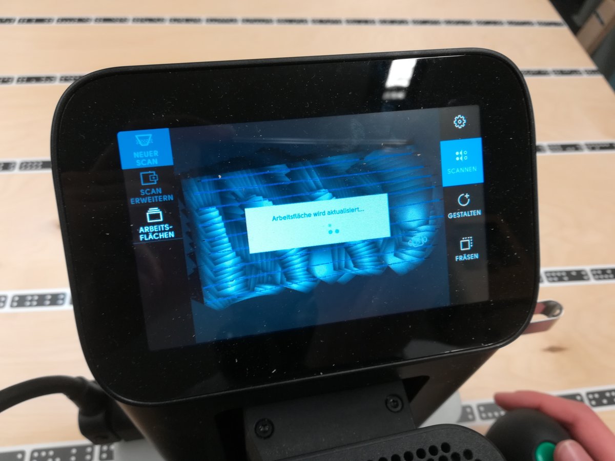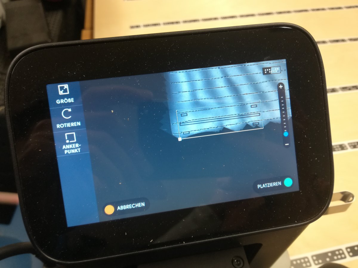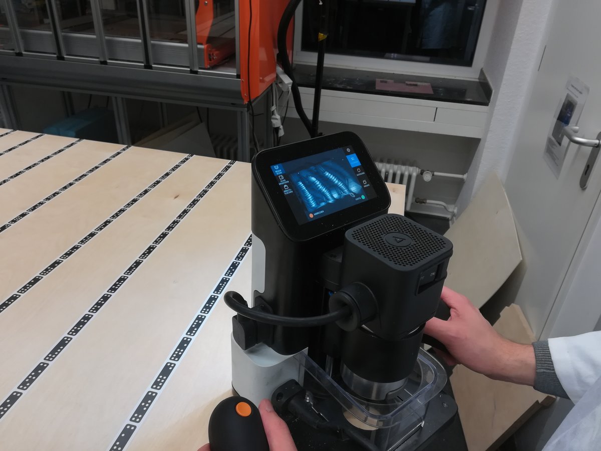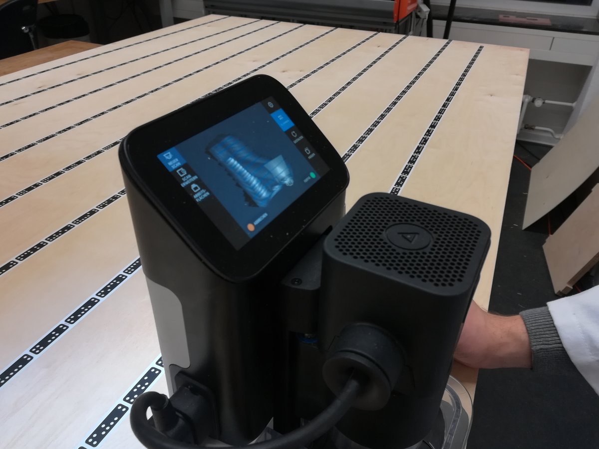 For this assignment, we were able to use a hand held CNC mill. Using tape with special visual markers (called shapertape), the mill is able to locate itself on a plane. As input, it requires a vector graphic of a shape that is to be cut. Parameters like depth and cut type (i.e. whether to cut on the inside, outside of the shape or on the line) can be encoded in the graphic via colors, but can also be set on the machine. The shape is then placed somewhere on the plane and the operator of the machine has to move along the lines; an indication of movement direction is shown on the display. The mill automatically corrects deviations from the path with the moveable drill head. If it detects that it cannot correct some motion, or cannot locate itself due to insufficient visible tape, the drill head is automatically retracted.