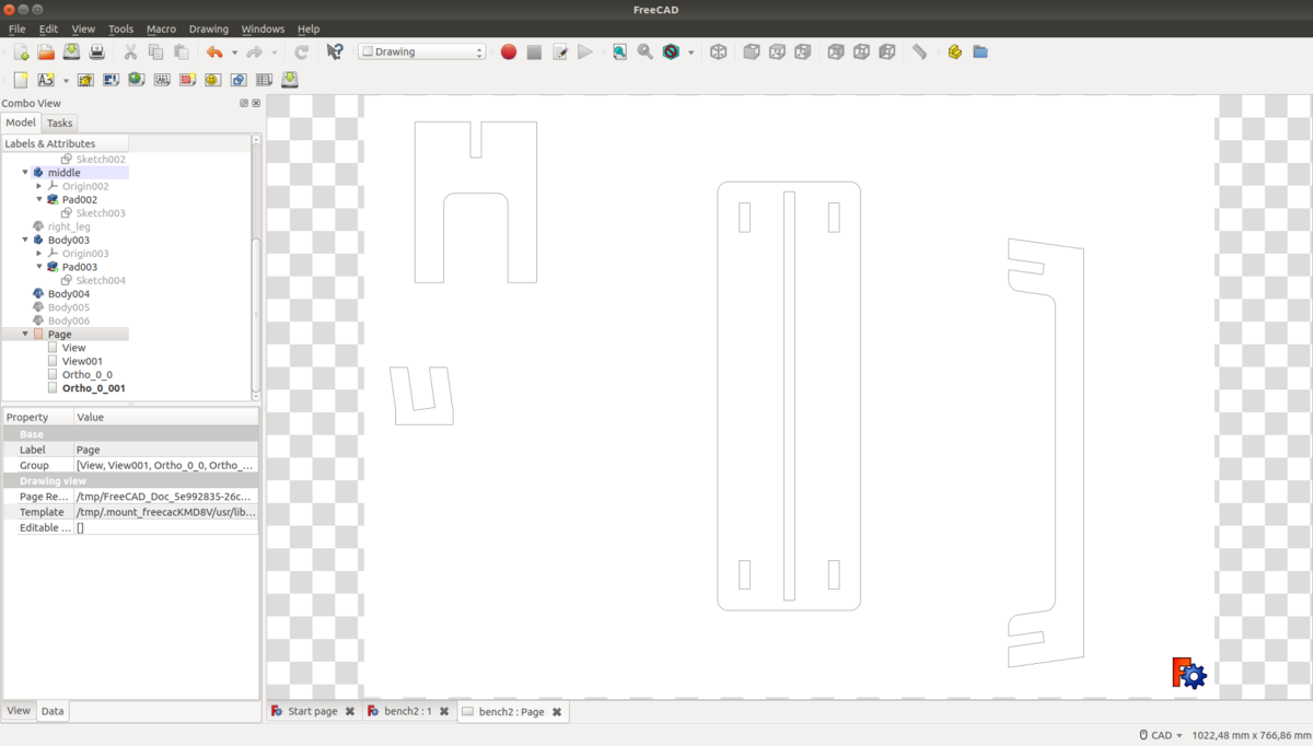 I made the design in FreeCAD, an open source CAD software. The bench consists mainly of four parts: the upper plank to sit on, two legs, and one piece of wood perpendicular to both the legs and the upper board, which holds everything together. I had to additional parts to hold the legs in place, since they are not orthogonal to the sitting plane, and our CNC mill can only cut perpendicular to its movement plane.