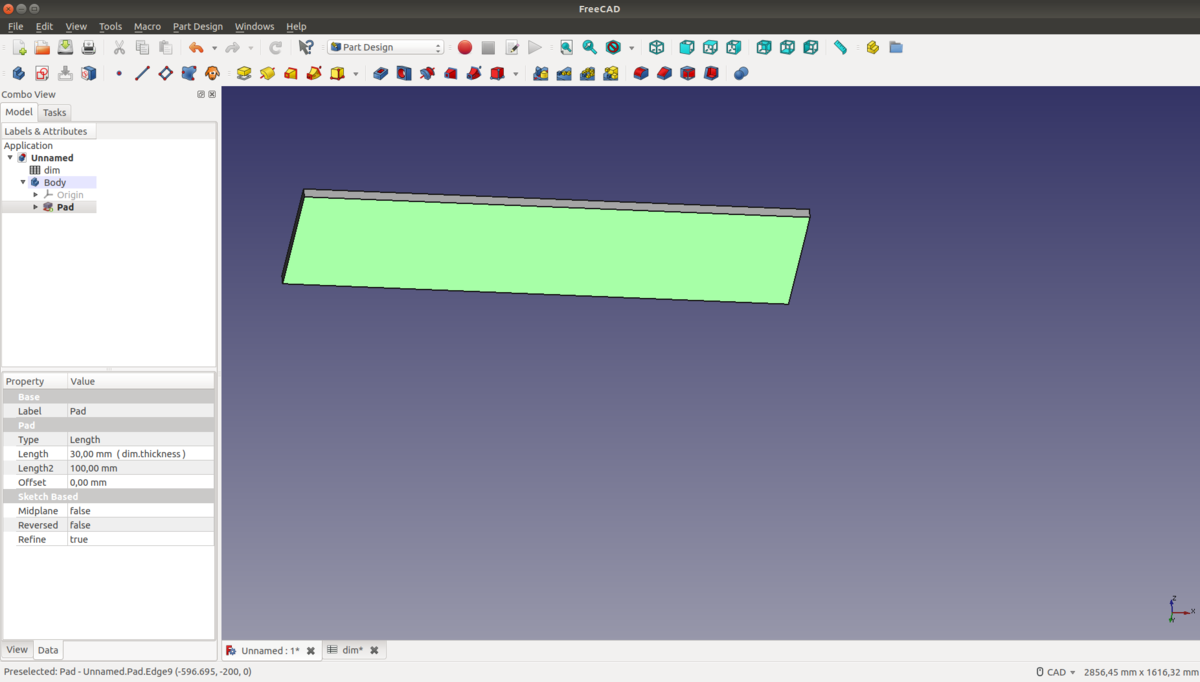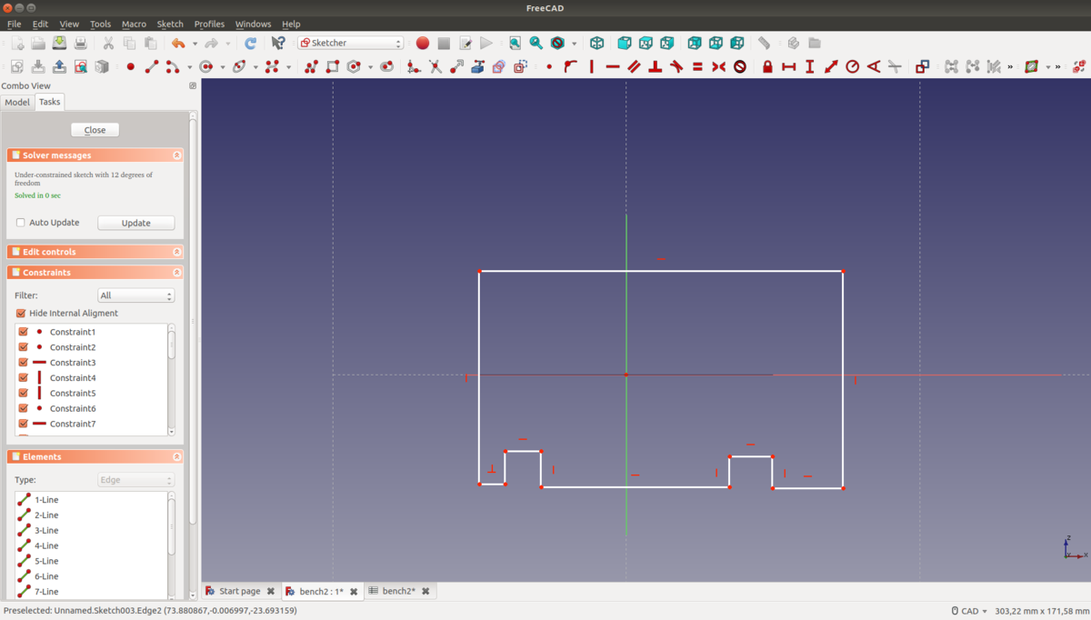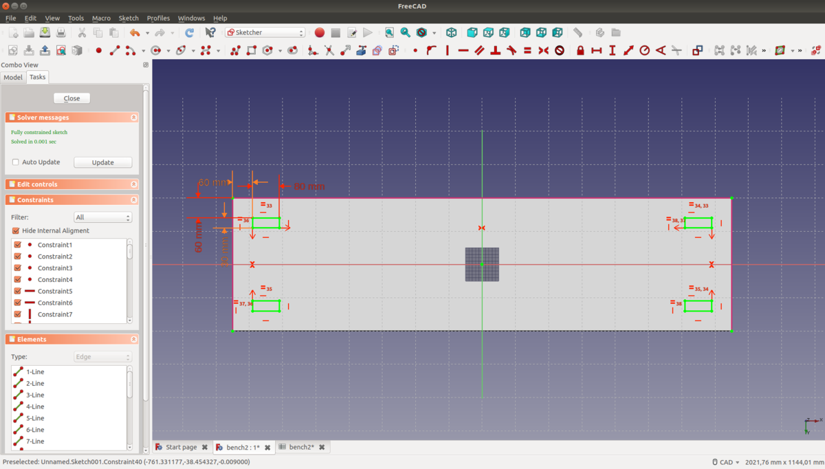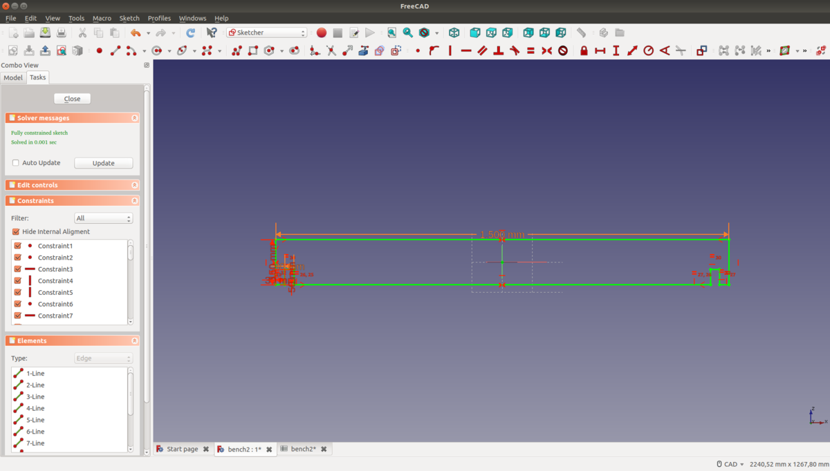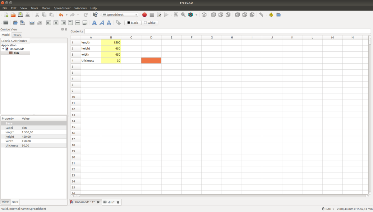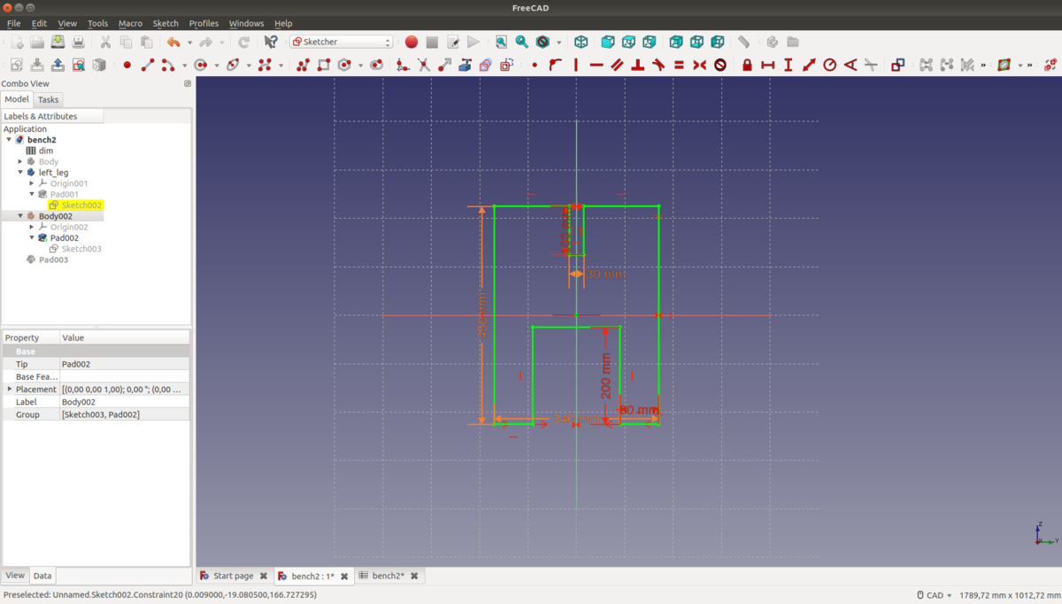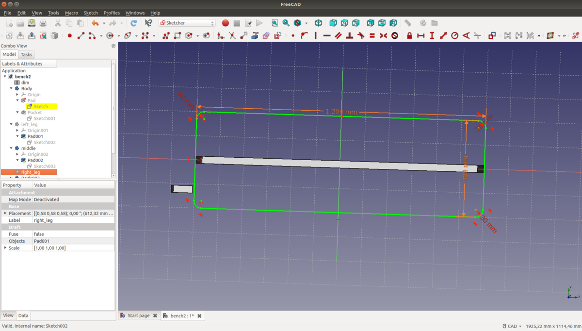 In FreeCAD, the available tools are separated in different groups called workbenches. To design the different parts individually, I used the Sketcher, Part Design and Part workbenches. In order to make the design parametric, I created a single spreadsheet that contains the adjustable parameters such as the desired length, width, and height of the bench as well as the thickness of the use material.