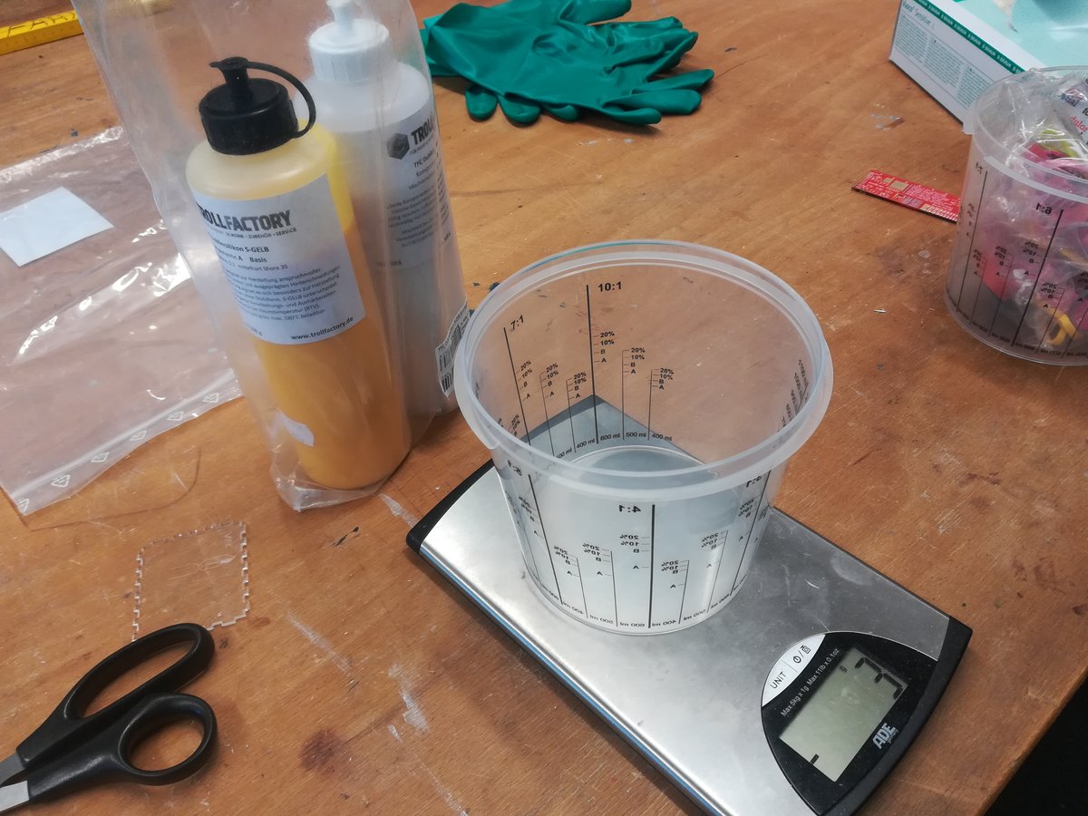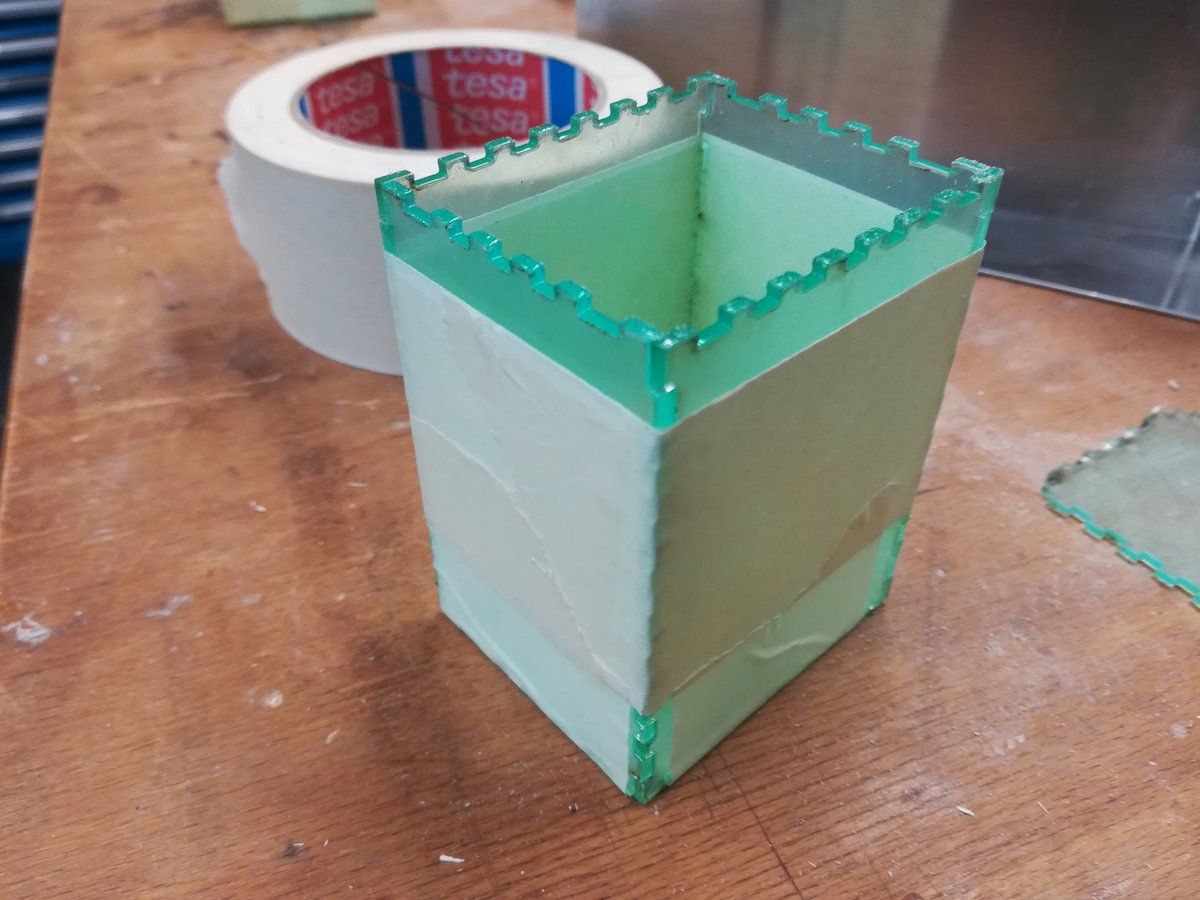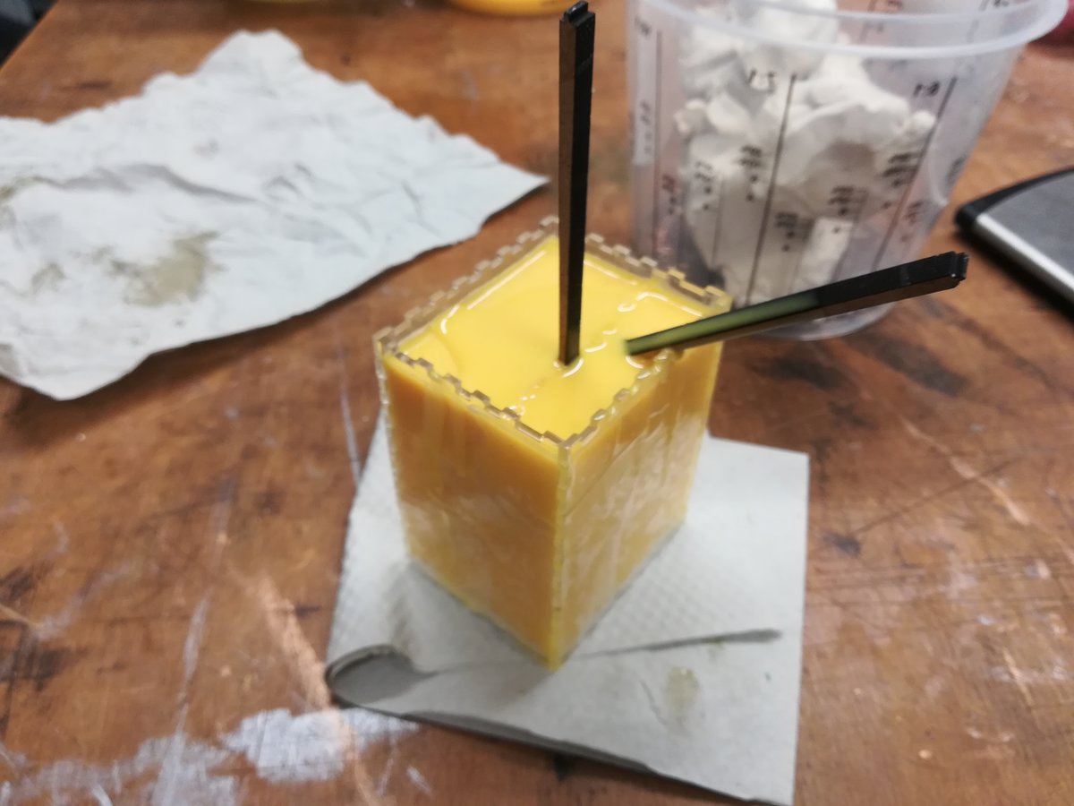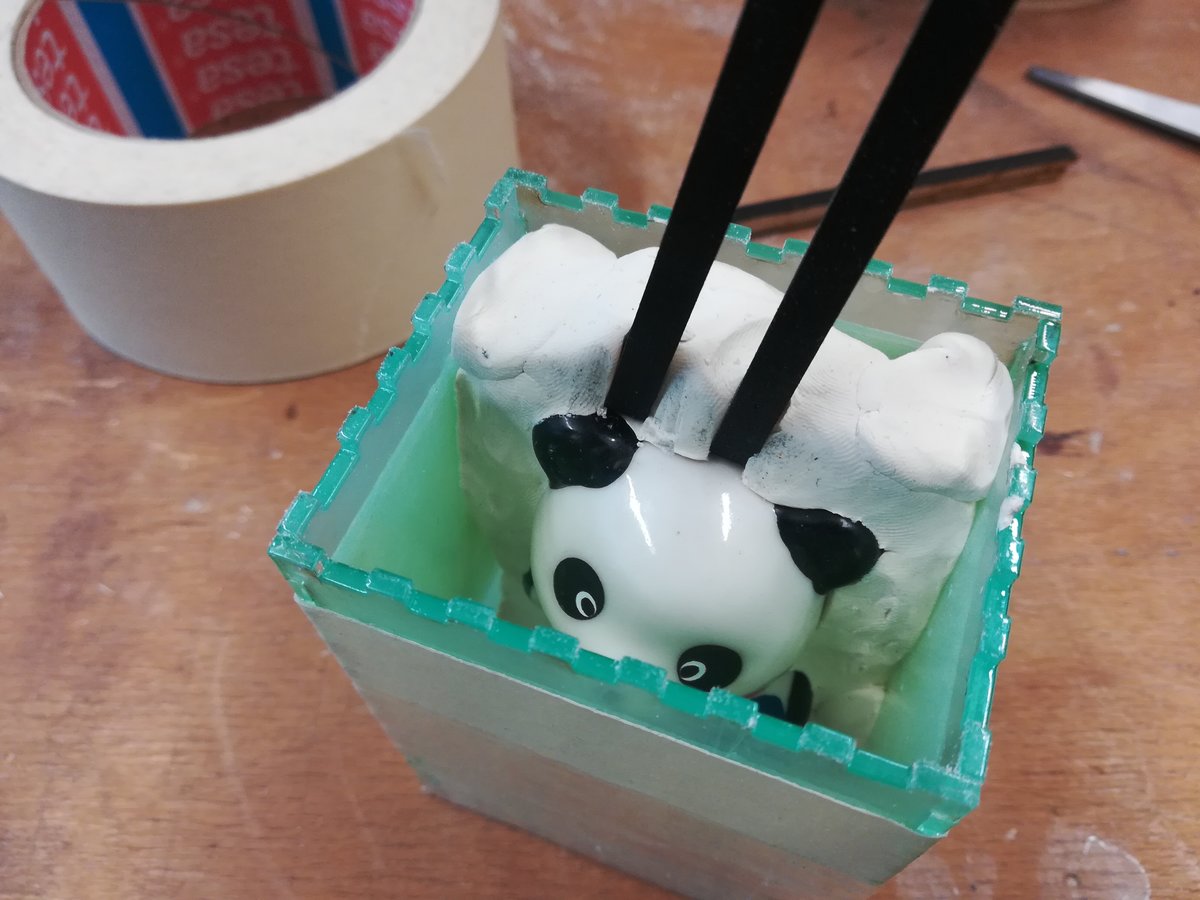 The first technique creates a mold from an existing object. First, I used the laser cutter to make a box out of plexiglass. The SVG file for the box was created by MakerCase, which is a very handy online tool that automatically generates vector graphics for use with a laser cutter, handling varying sizes, joints, and laser cutter parameters. Then I put the figure in the box and filled one half with dough; the other half is filled with two-component silicone. It's important to make sure that the box is free of leaks, otherwise the silicone will create a huge mess. Additionally, it is helpful to indent the dough a little in a couple of places, to ensure a proper fit between both parts of the mold. After I sealed the sides of my box with some tape, I mixed some silicone and poured it in the free half of the box. The silicone takes about three hours to solidify, so I went home and called it a day.