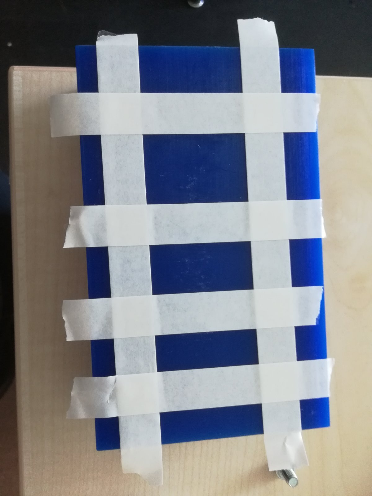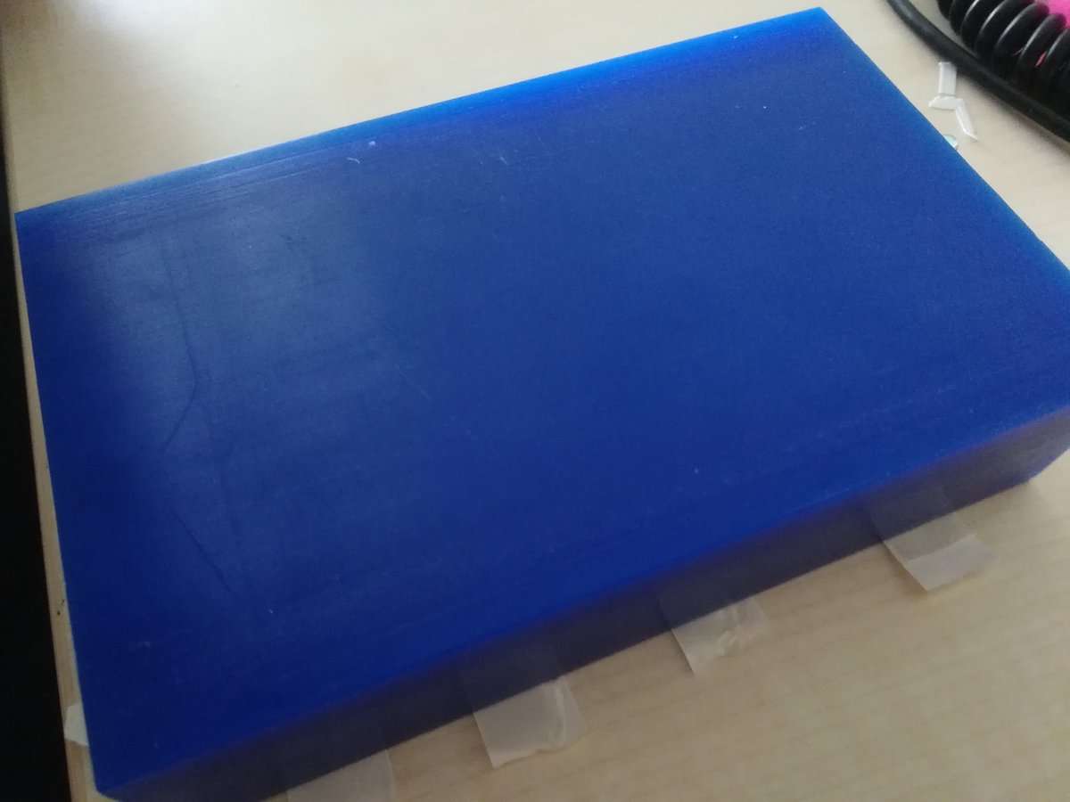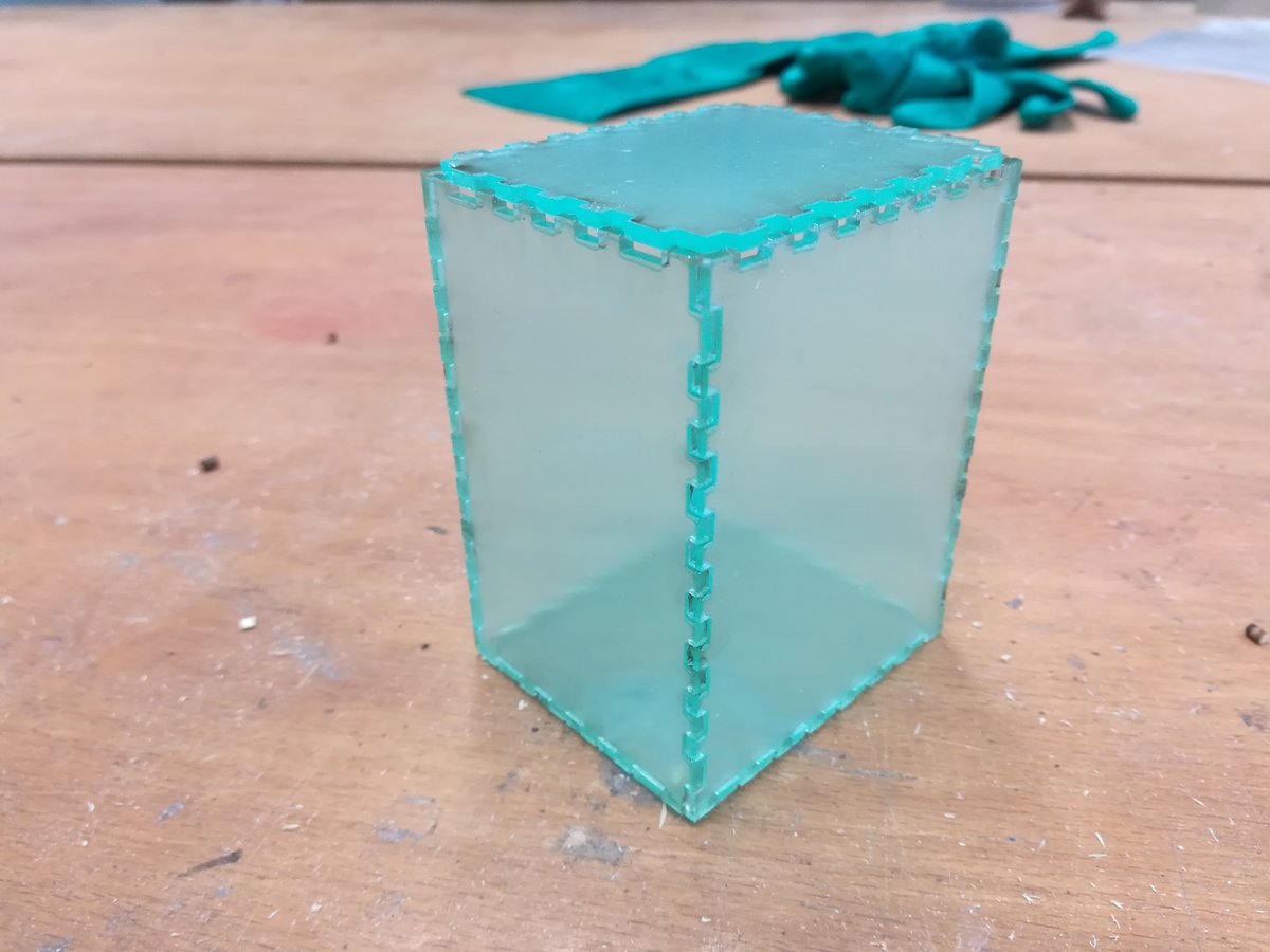 The first technique creates a mold from an existing object. First, I used the laser cutter to make a box out of plexiglass. The SVG file for the box was created by MakerCase, which is a very handy online tool that automatically generates vector graphics for use with a laser cutter, handling varying sizes, joints, and laser cutter parameters. Then I put the figure in the box and filled one half with dough; the other half is filled with two-component silicone. It's important to make sure that the box is free of leaks, otherwise the silicone will create a huge mess. Additionally, it is helpful to indent the dough a little in a couple of places, to ensure a proper fit between both parts of the mold. After I sealed the sides of my box with some tape, I mixed some silicone and poured it in the free half of the box. The silicone takes about three hours to solidify, so I went home and called it a day.