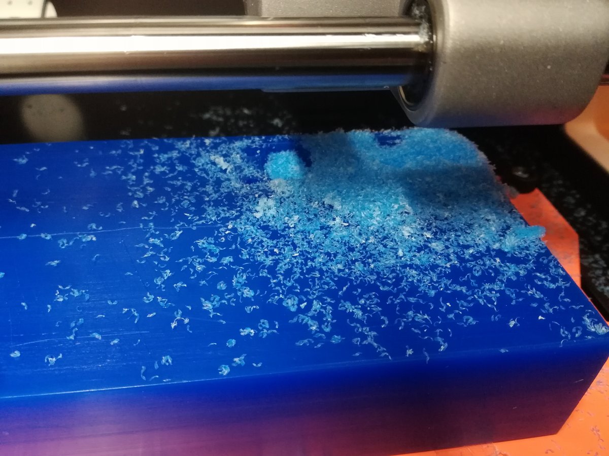 To mill the mold, I used our labs new Roland CM-20 CNC mill with a 3mm tool. There are three milling steps involved: first, flattening the material surface, then rough cutting of the form, and finally fine cutting to give the surface a nice smooth finish. The mold is made out of machinable wax.