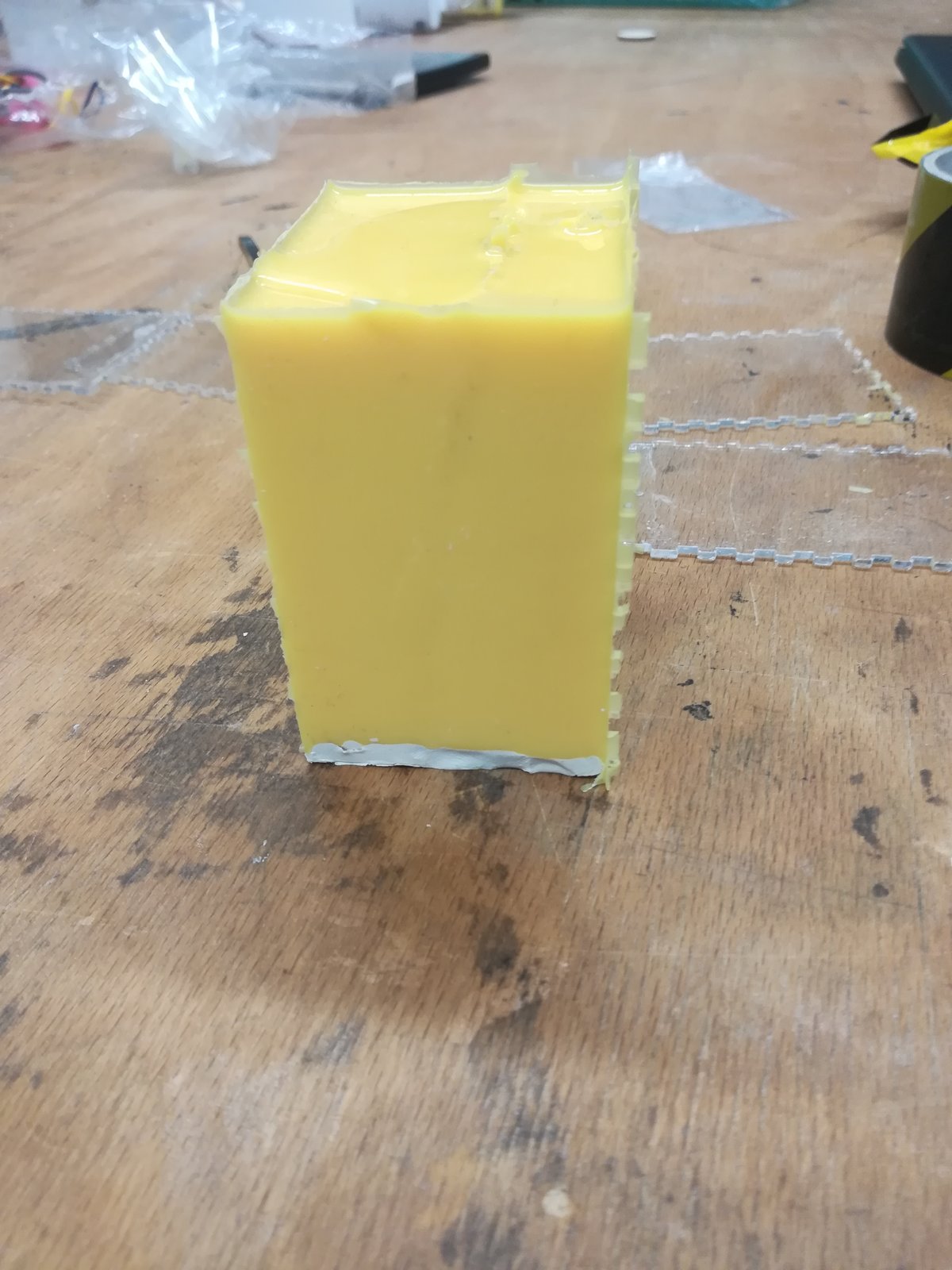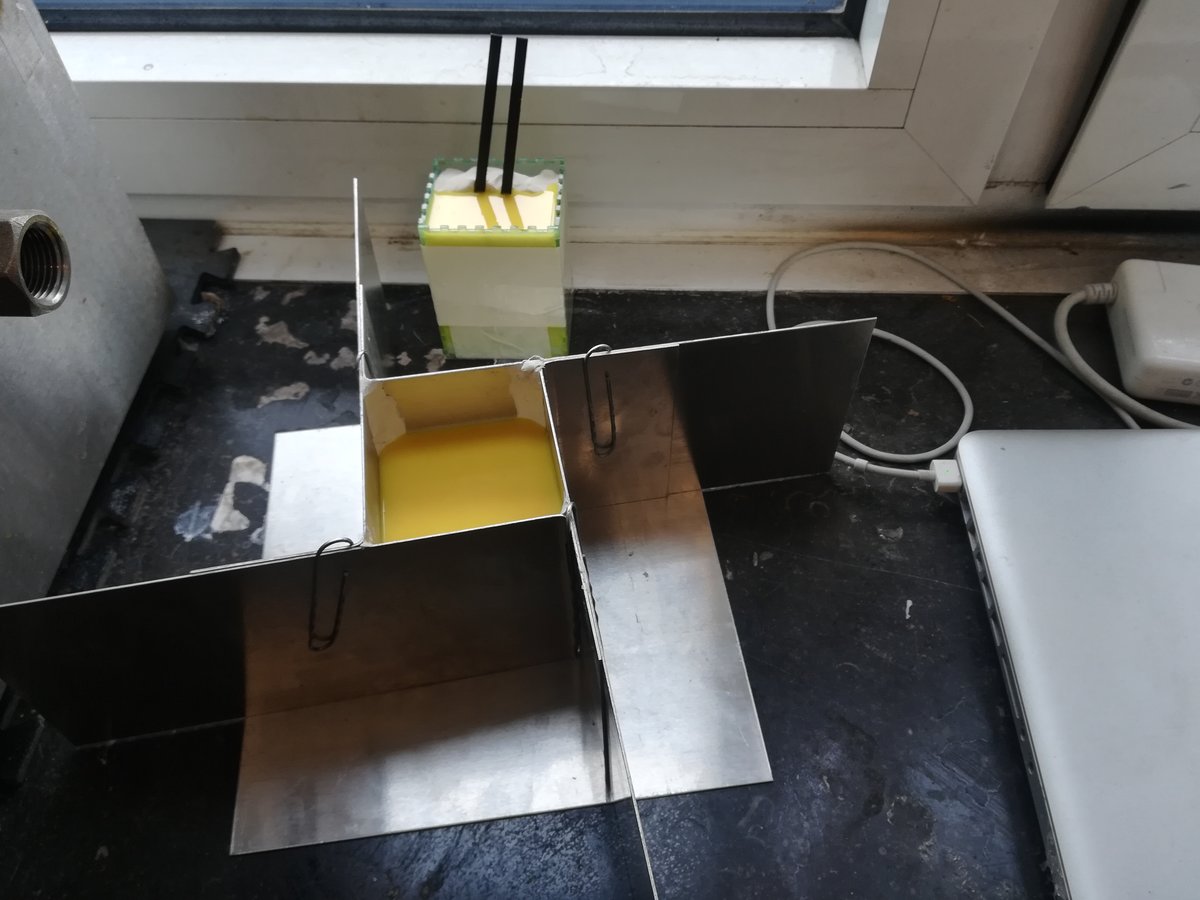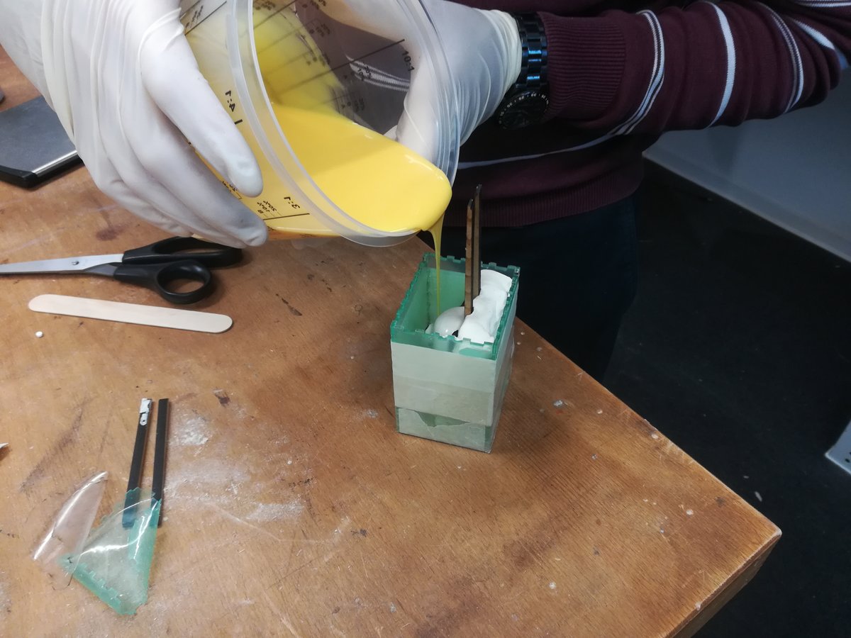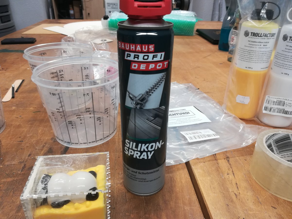 The next day, I opened the box and removed the half filled with dough. Then I mixed silicone for the other half of the mold. Before pouring it into the empty half of the box and waiting for another three hours, I sprayed the inside of the box with silicone spray to avoid the two halves forming a single block of silicone. But apparently, I did not use enough of the spray, because the halves did end up as one single block.