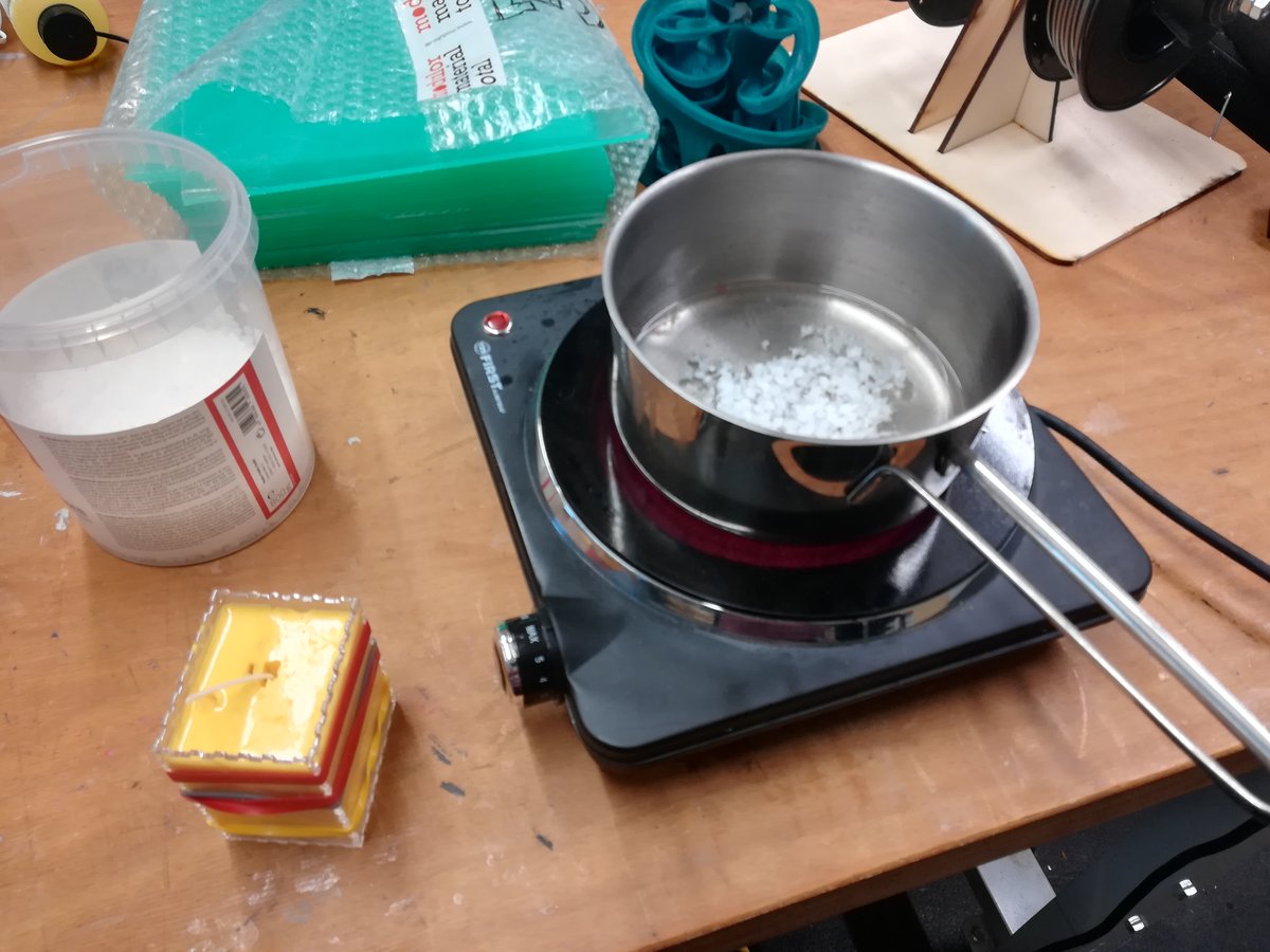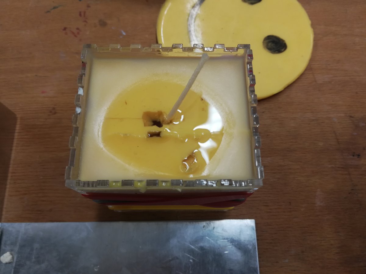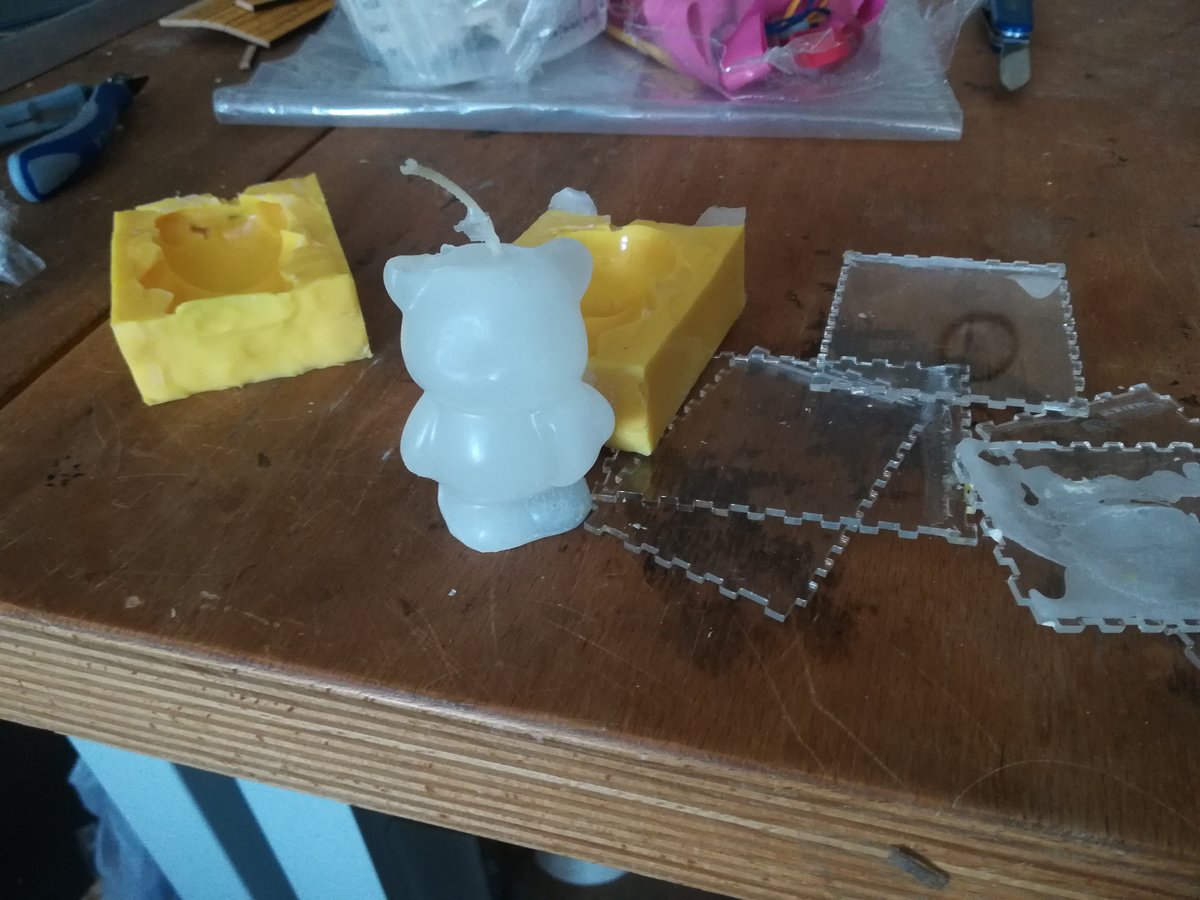 I had to open the mold with a knife (carefully, I didn't want to destroy the figure). The I could insert a wick into the mold and heat some wax to make a candle. Pouring the wax into the mold was a little difficult because its air inlet was right next to the hole for the wax and it clogged up a little. Then the wax had to cool for some time. The candle turned out pretty nice, but there are lots of bubbles enclosed in the bottom and there is a little part of the ears missing, probably because I did not pour enough wax.