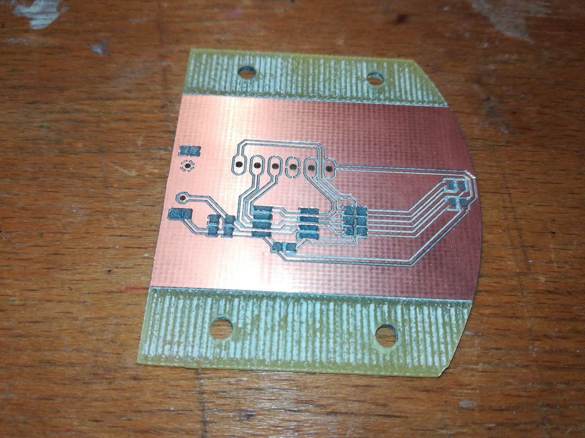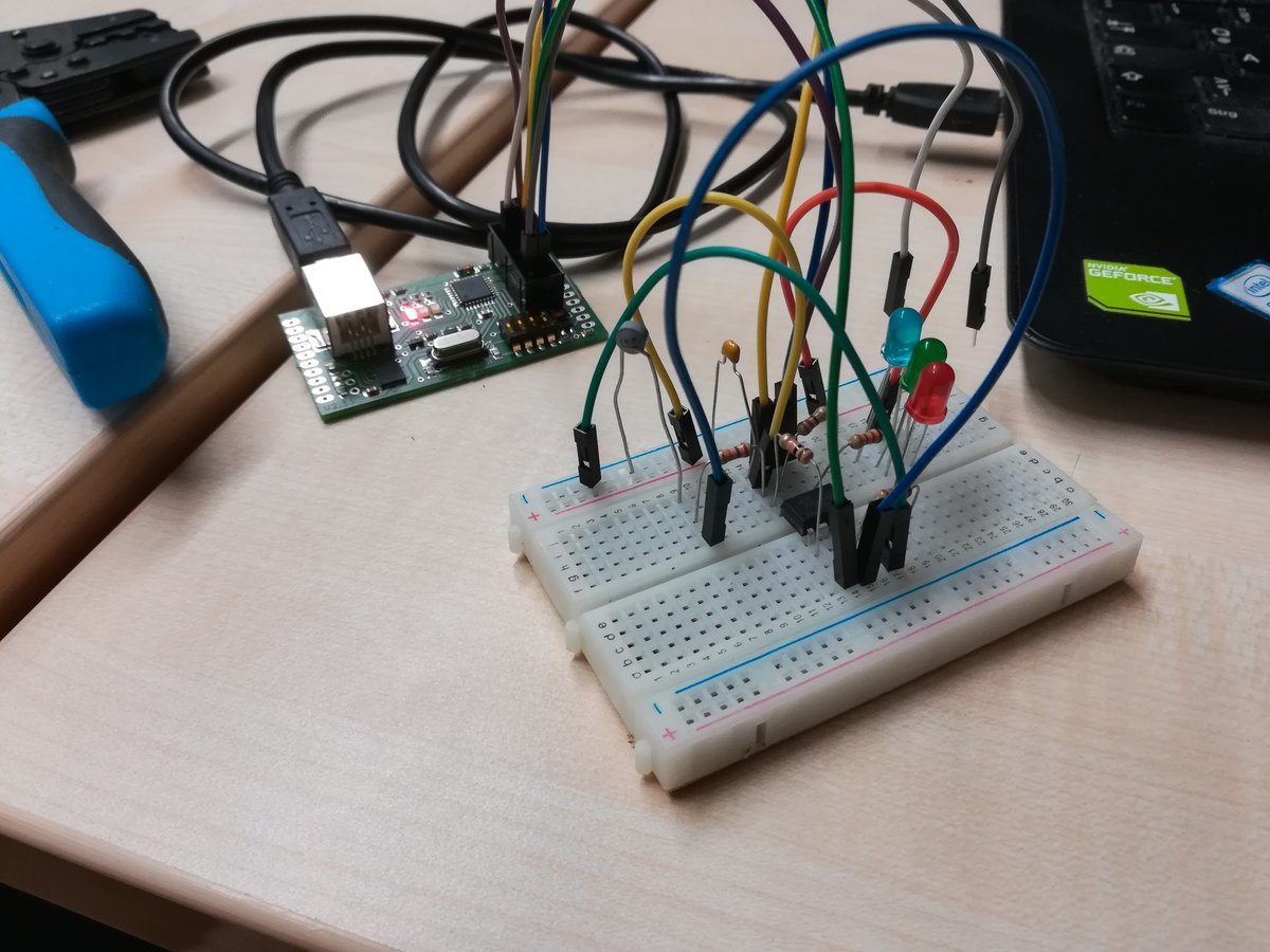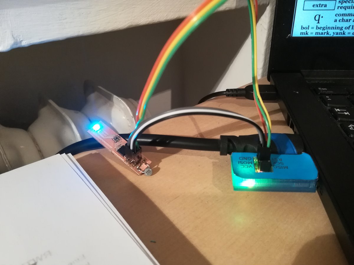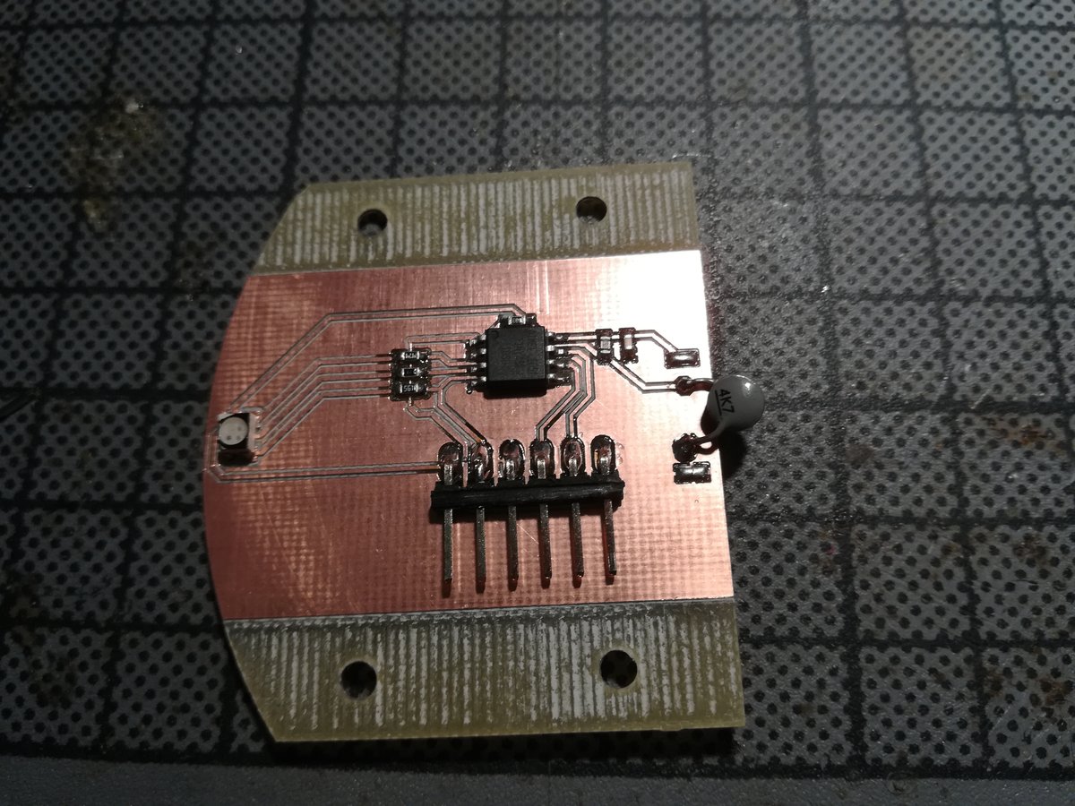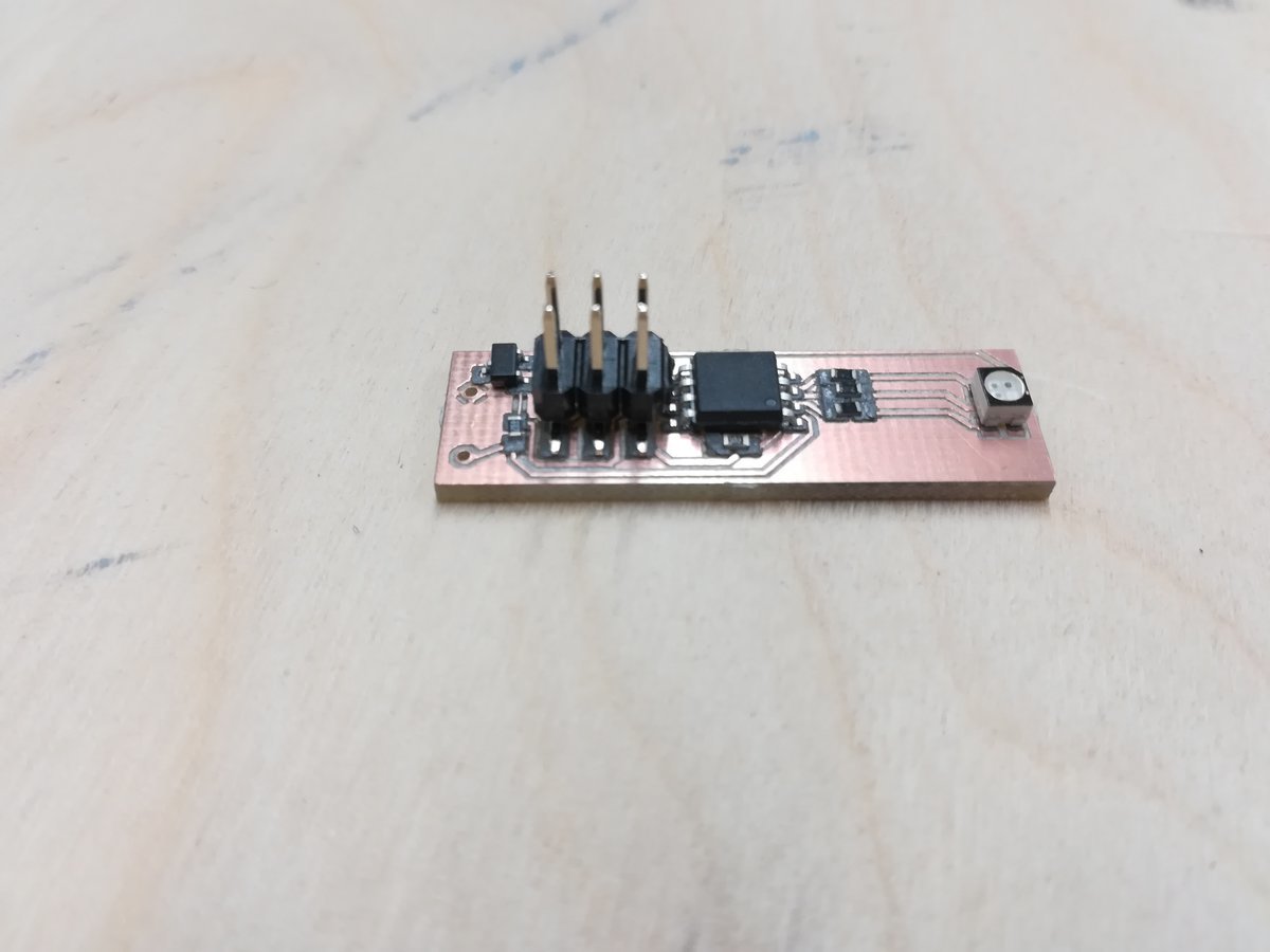 Making the board this way took me only around 45 minutes, but when I wanted to program it, I messed up some wires... and apparently neither the Attiny nor the LED took that well, as the board began to smoke after a couple of seconds. Luckily, neither my Laptop nor my ISP took damage, but the board was completely bricked.