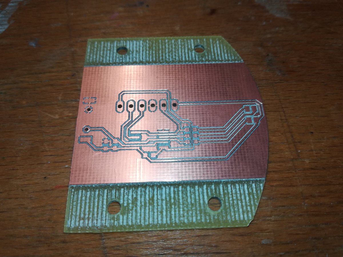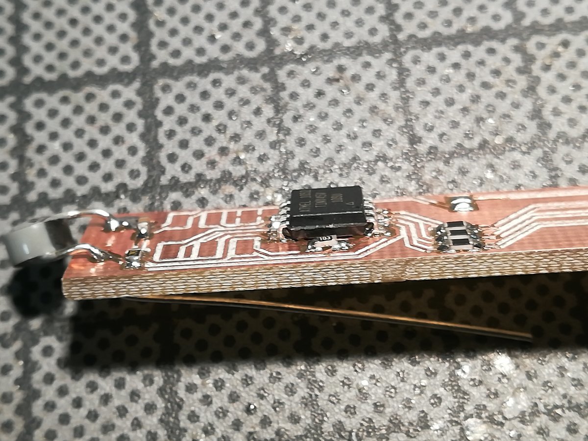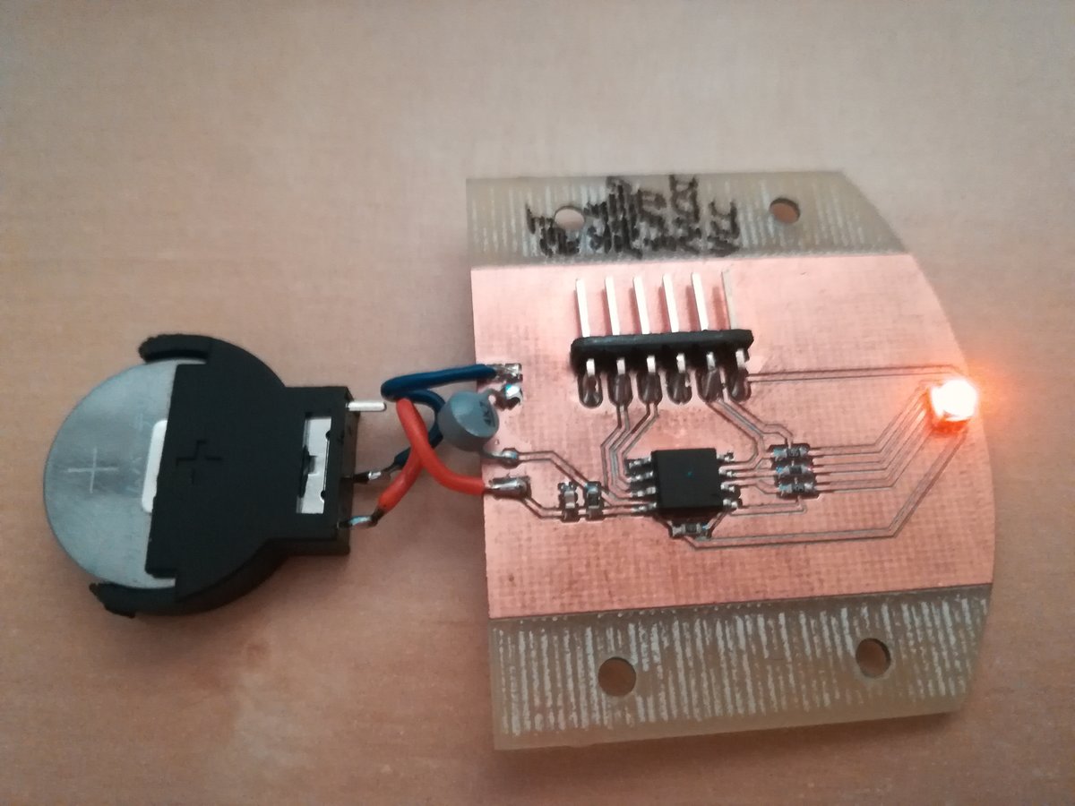 The schematics of the PCB did not change much, but I added connections to a 3V coin cell and redesigned the board so that I don't have to remove the ISP header. This is incredibly handy when testing the firmware. Milling and soldering was a breeze with laser cut stencil, solder paste, and hot air gun.