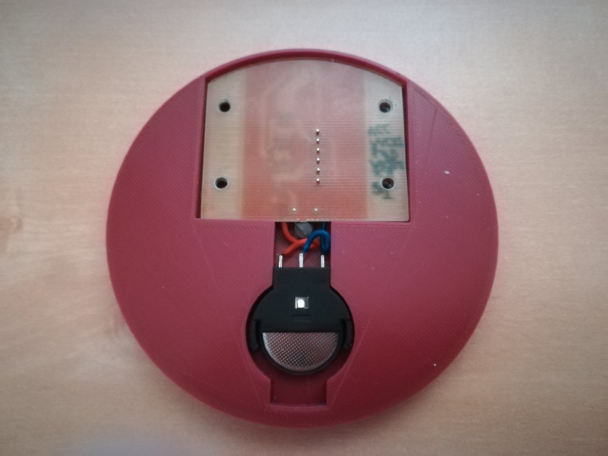 The first version I made used a very small PCB that would be pushed into the coaster; due to the low height and small outline of the PCB, it was necessary to program the chip and then remove the ISP header, otherwise the board would not fit in the coaster. This proved to be quite error prone, as I bricked several ATTinies trying to get this to work. Nevertheless, I had a prototype. I later designed Version 2, which features a larger board, easier assembly, and which could be reprogrammed easily. What's more - and maybe most important - Version 2 has a battery slot, which I forgot to add in the first try. Additionally, I derived the necessary calculations more thoroughly, using only integer values.
