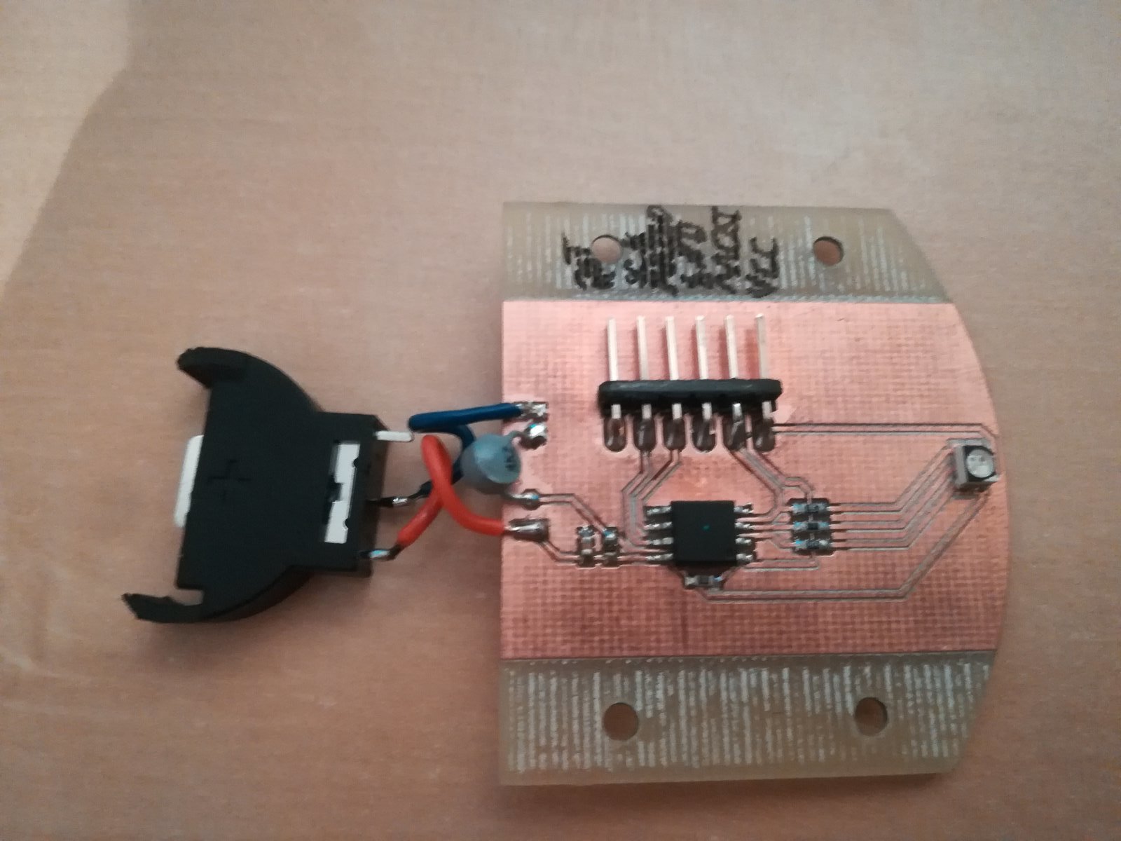 So I made another one. This time, clever me decided it would be nice to try not to solder the ISP header onto the board, but just program it while holding the contacts together. Needless to say, it didn't go too well and I had another short. Well, third time's the charm, right?