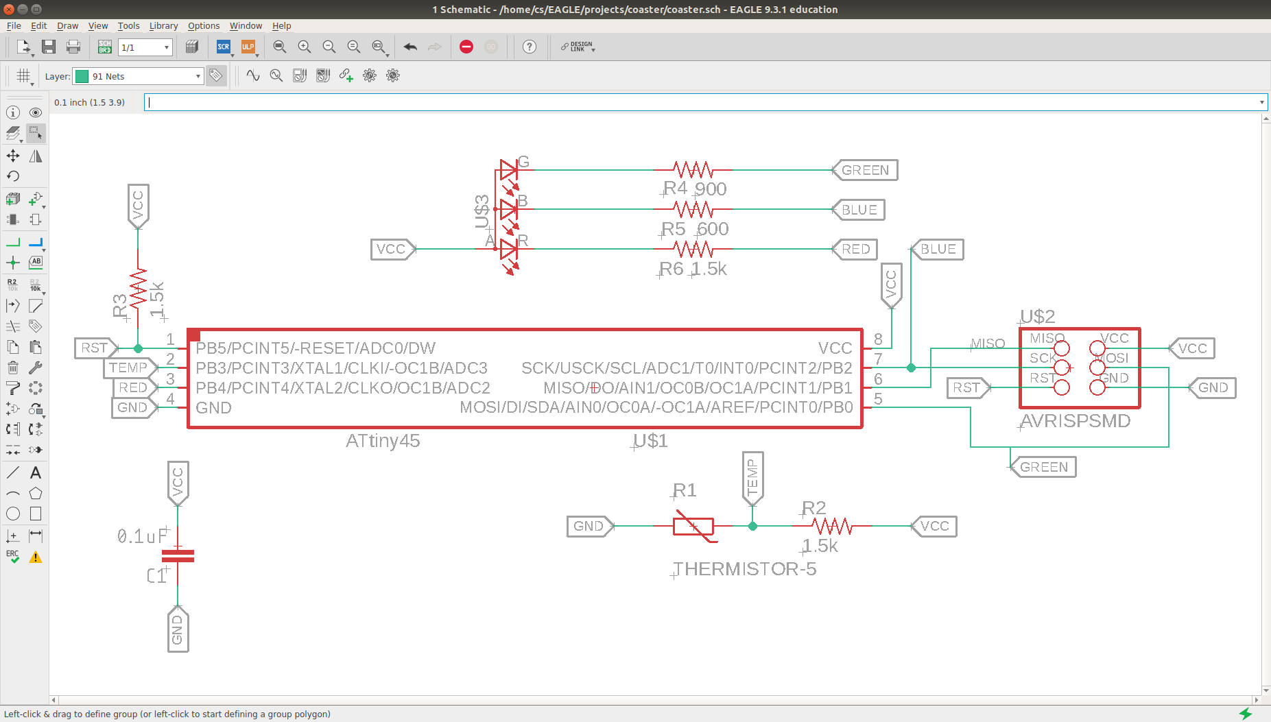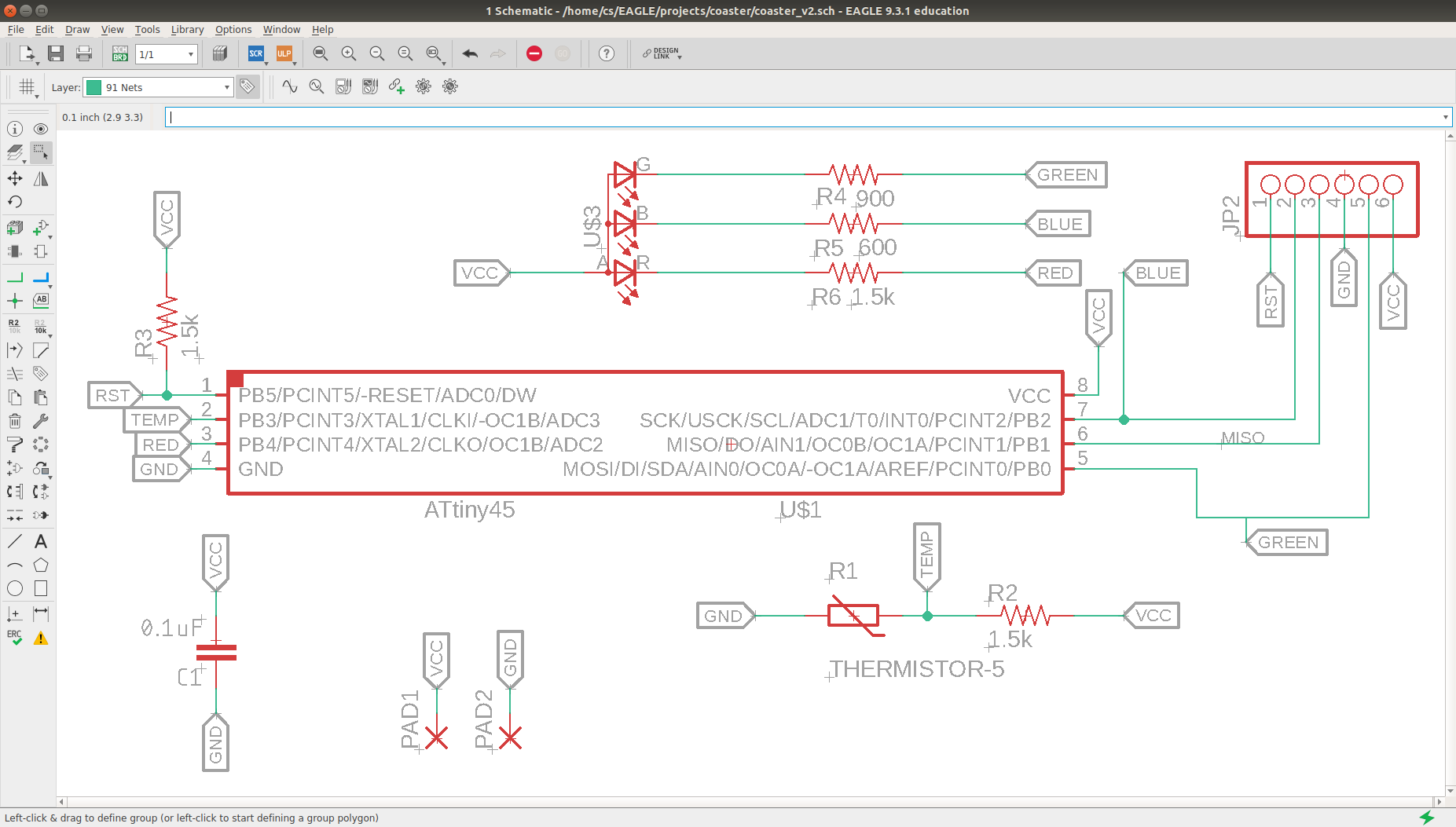 Since the Attiny45 only has 6 I/O pins, I had to assign multiple functions to some of them; most notably, the signal pins to program the Attiny are the same pins that control the LEDs. I used the 24kΩ resistor and the thermistor to create a voltage divider, which is connected to pin 3 of the analog to digital converter (ADC) of the Attiny. The schematic and the routing below were done in Autodesk Eagle. They can also be found in the download section.