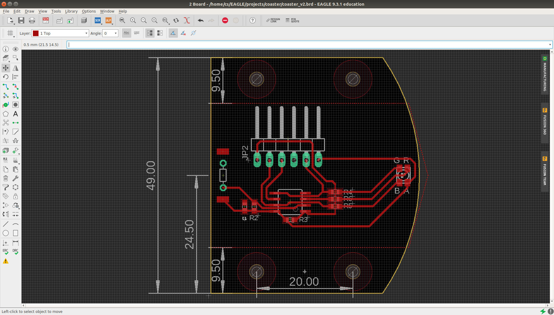 For the redesign, I changed the coaster so that the PCB is inserted from the bottom and held in place with screws; also, I added space for the battery.