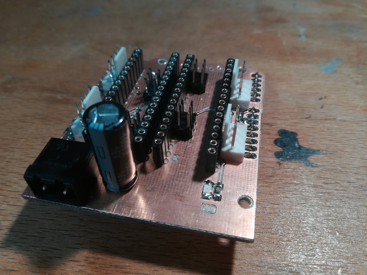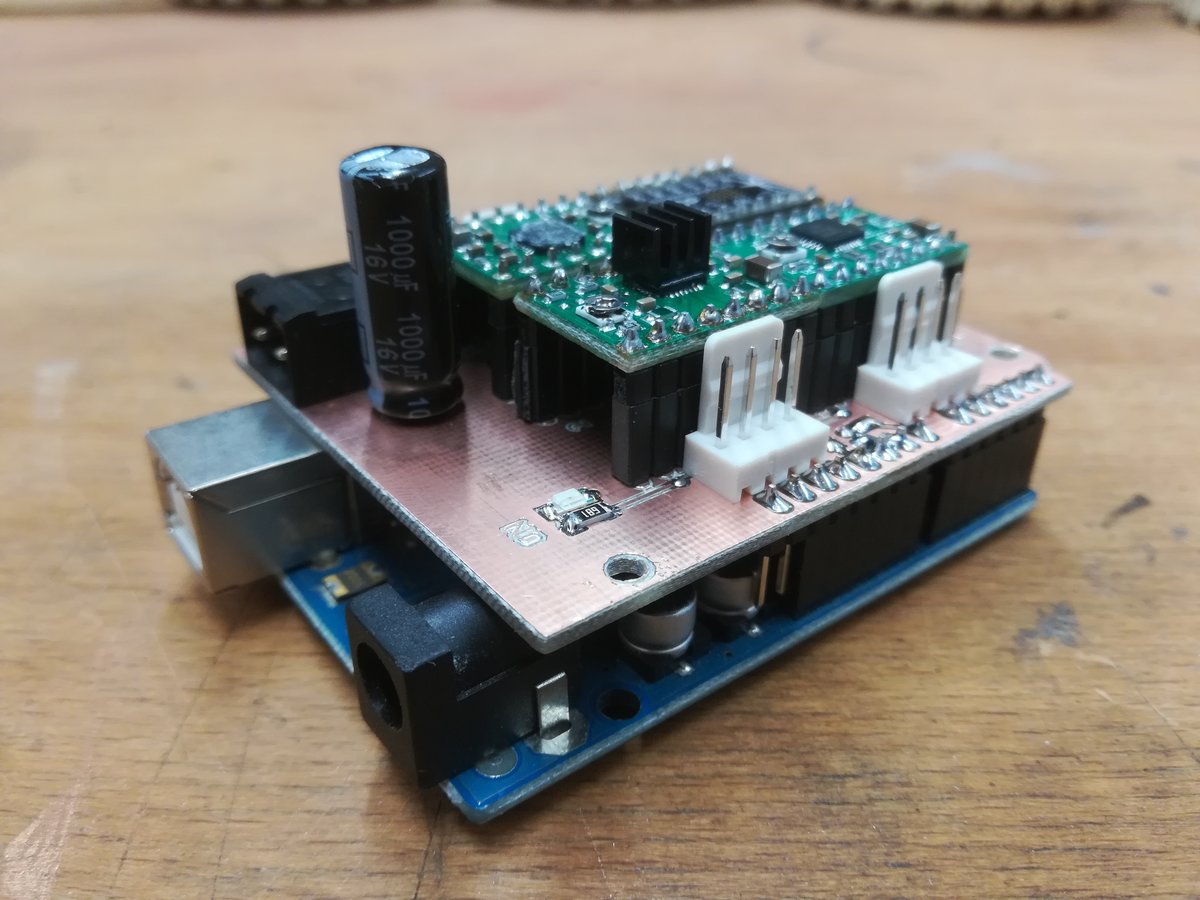 Our machine requires four motors, one attached to each of the four ropes holding the ring in the middle. We used stepper motors, since they are comparatively easy to control and have a high torque and precision. I designed a shield for the Arduino Uno which features a power indicator, a connection to an external power source, and space for up to four stepper driver boards of type A4988. The step and direction pin of each driver is connected to an I/O pin on the Arduino. Microstepping mode can be selected via hardware jumpers. All drivers are always enabled. Because space is really tight with four drivers, the board is double sided.
