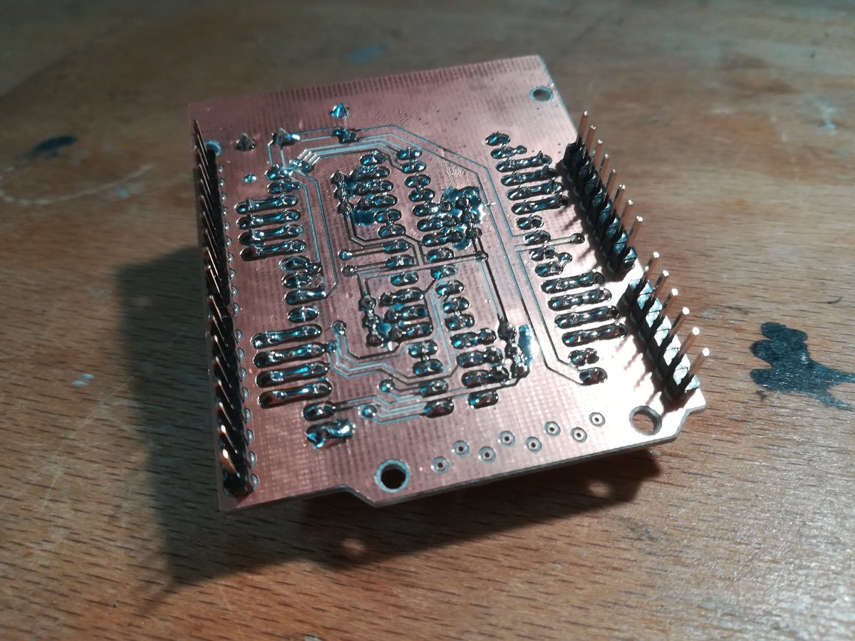 However, designing a useful machine is hard, and there were not many restrictions on this weeks assignment, so we decided to build a motorized ball game: A ring with a light sensor is attached to four ropes, which can be lengthened and shortened to move the ring around, much like the famous sky cam (but a little less sophisticated). The goal is to throw a ball through that ring to score points; once a hit is detected, the ring is moved to another position. To get more details on the machine and a higher overview of what we built, visit our group assignment page. My contribution is a motor controller shield for an Arduino.