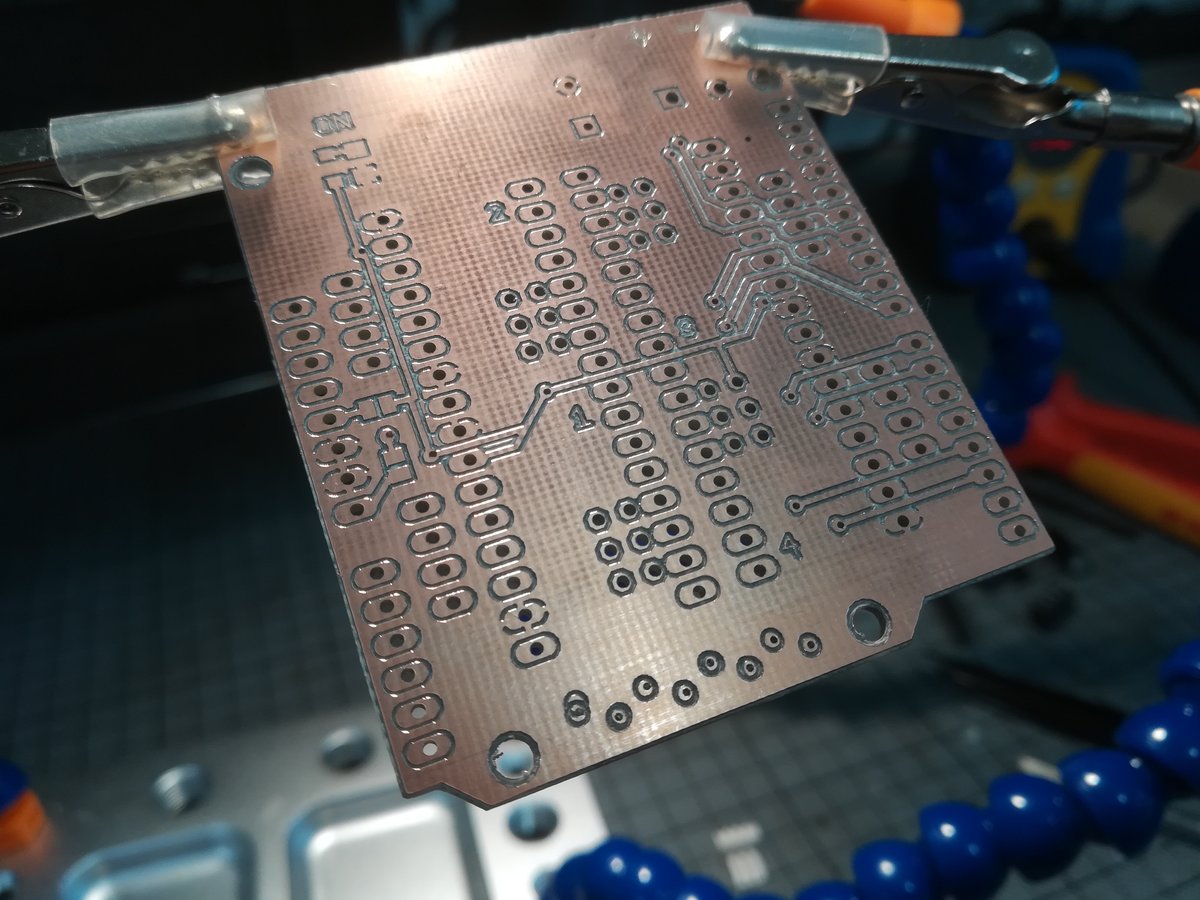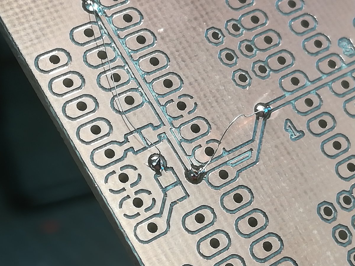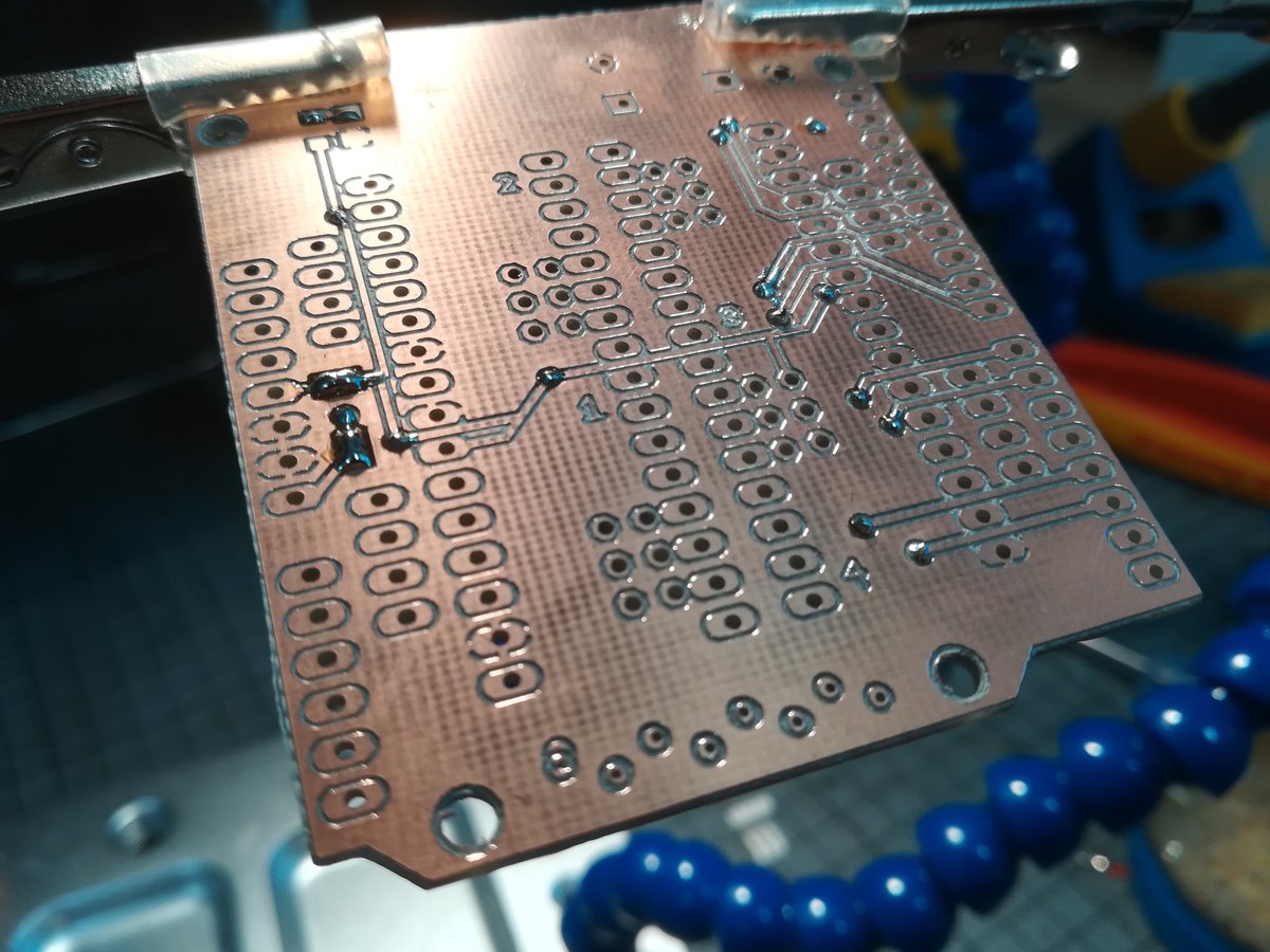 I had to hand-solder the vias with thin wire and solder, so I tried to design the board in a way that minimizes the via count while making the necessesary vias easily accessible. This way of making vias works, but is cumbersome to solder a lot of them, and they cannot be put underneath SMD components. I would really like a way to get plated through holes and vias like it's done on a professional level.