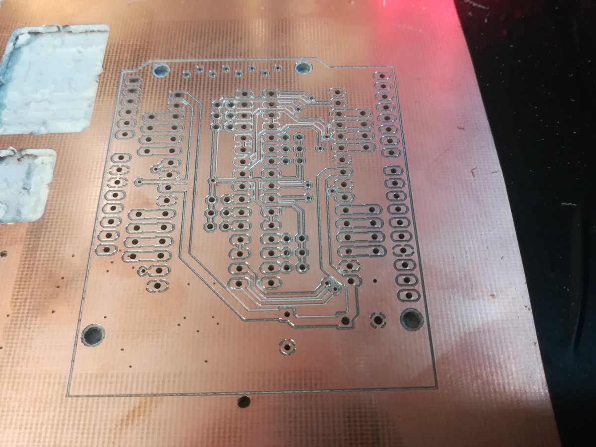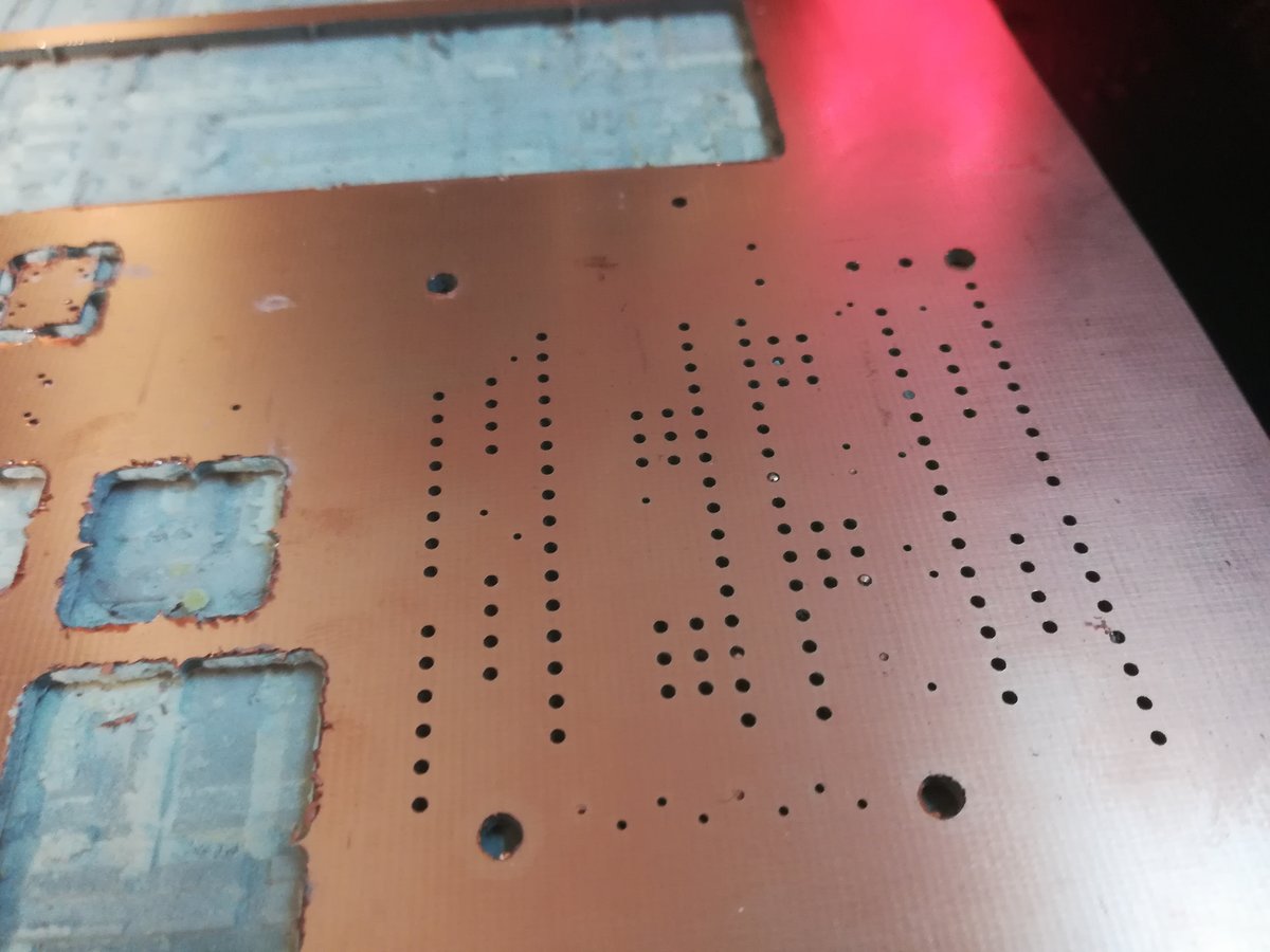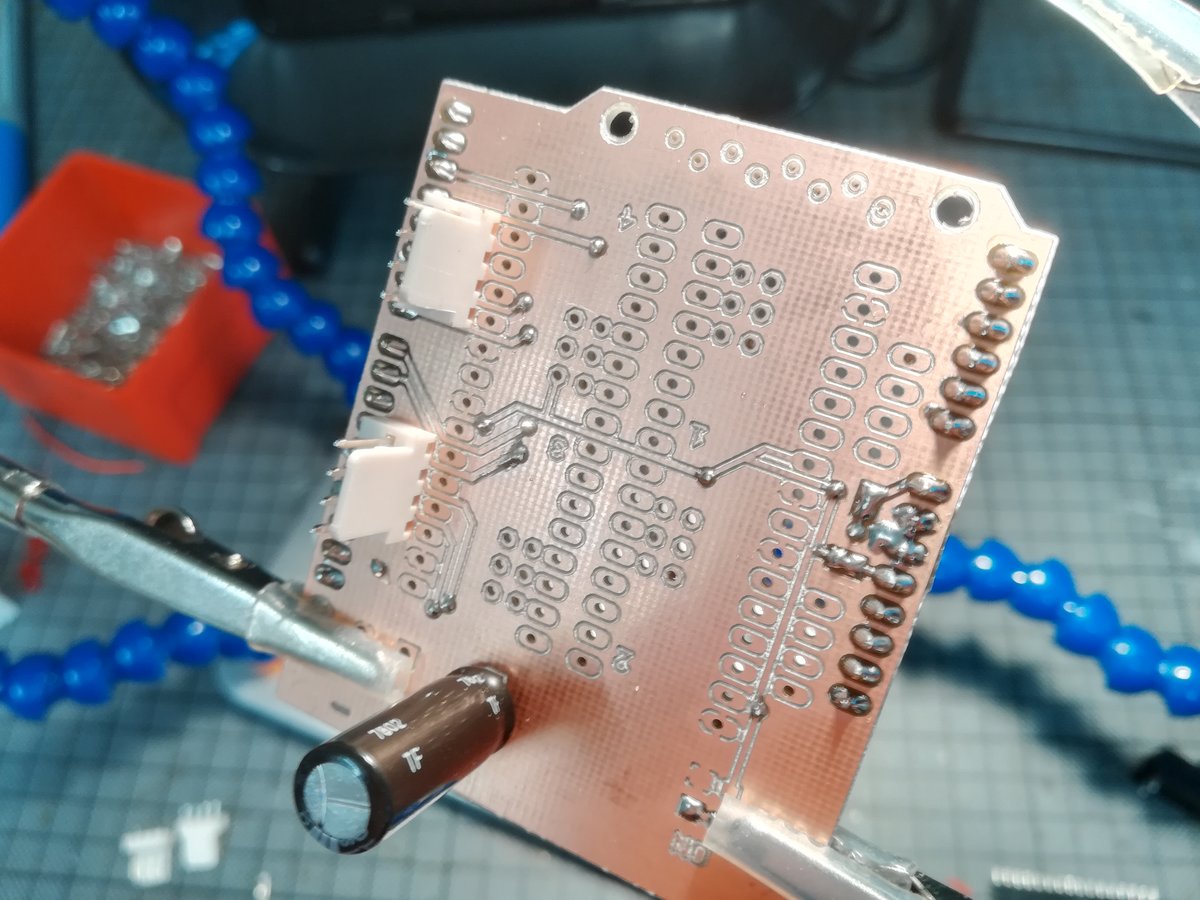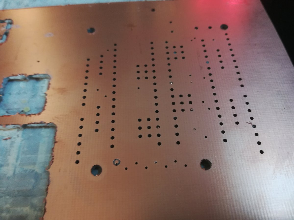 I had to hand-solder the vias with thin wire and solder, so I tried to design the board in a way that minimizes the via count while making the necessesary vias easily accessible. This way of making vias works, but is cumbersome to solder a lot of them, and they cannot be put underneath SMD components. I would really like a way to get plated through holes and vias like it's done on a professional level.