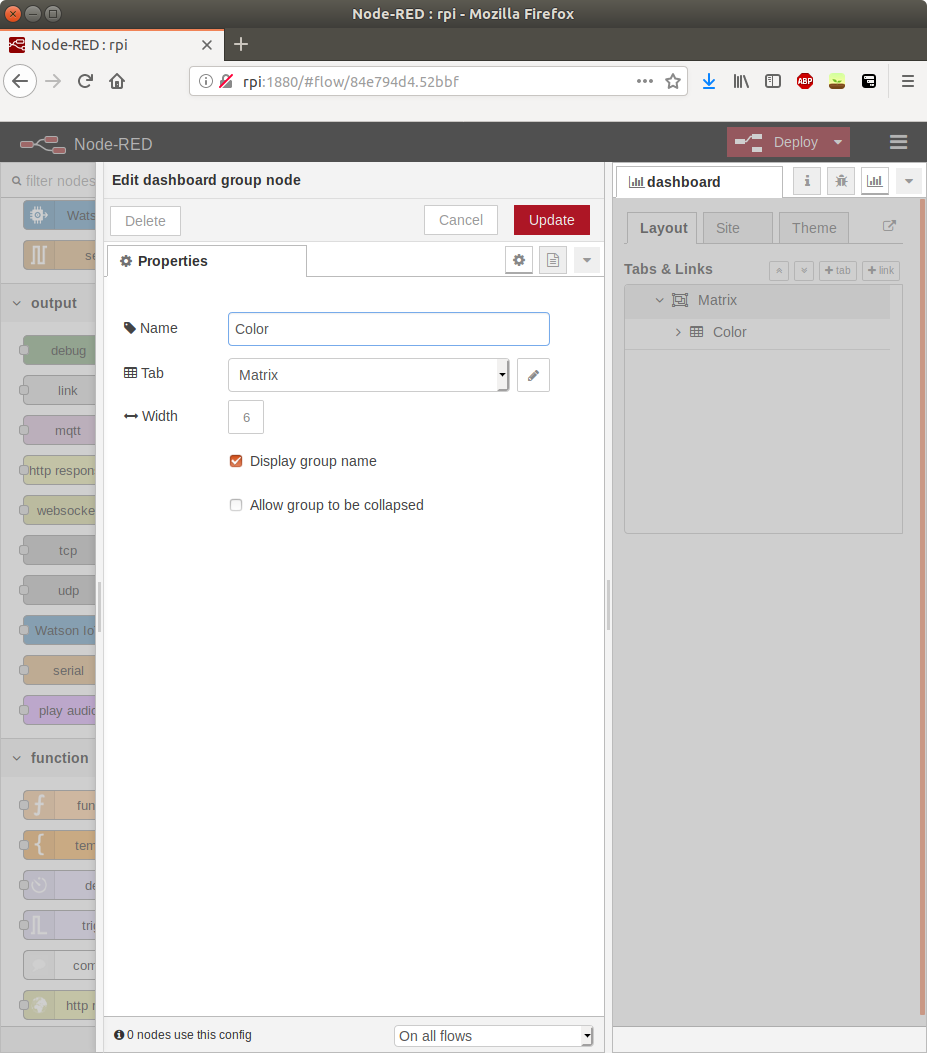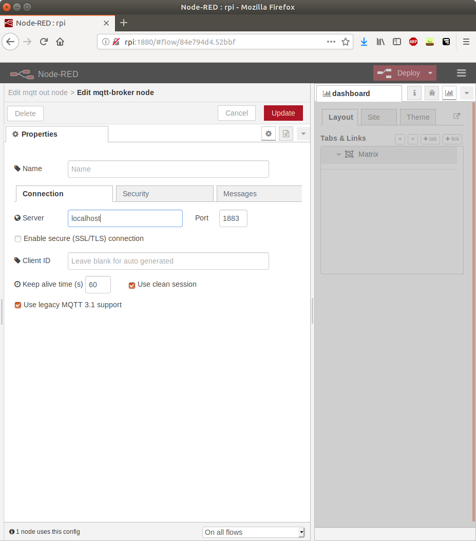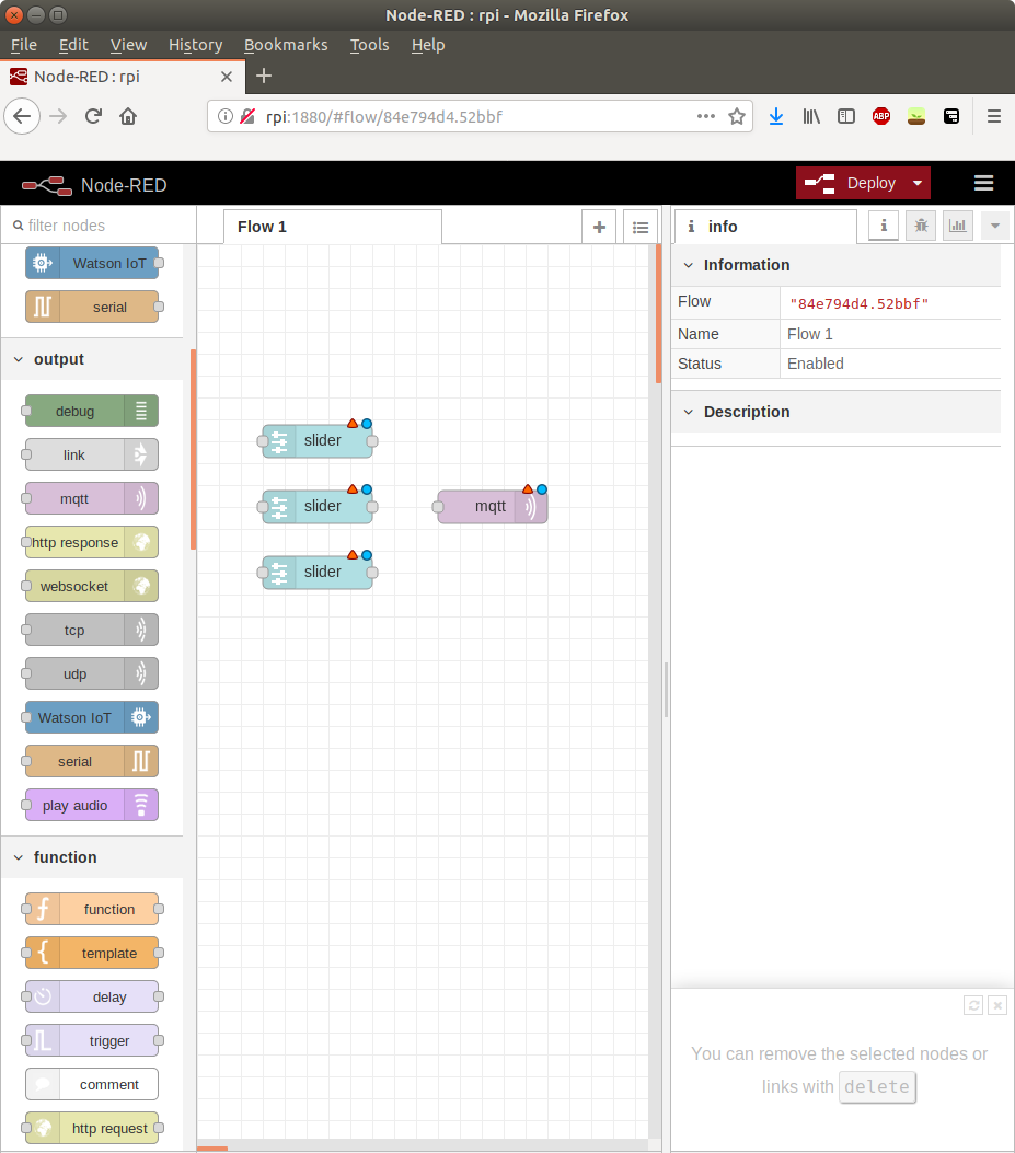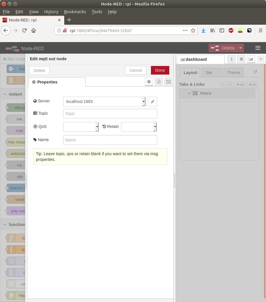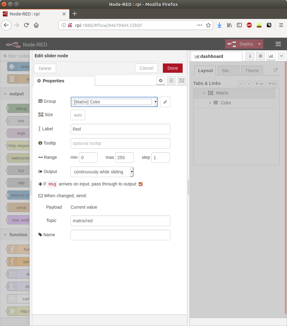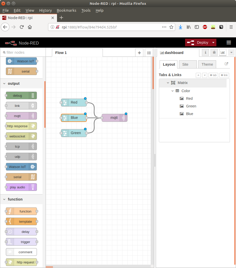First, I added a tab called "Matrix" that will hold all user interface controls for the LED matrix. Then I added a group to this tab called "color" which will provide controls to light up the matrix in a single color. Next, I added three slider nodes and one MQTT output node, which will act together to forward color changes to the ESP32. Node properties can be edited by double clicking on that node. I gave all three sliders names and specified the mqtt topic they will publish on. For the mqtt output node, I specified the local mqtt broker as server, and left the topic field blank so it will get populated by the message. The three sliders are connected to the mqtt output ndoe. Finally, the flow has to be deployed by clicking on Deploy in the upper right corner.