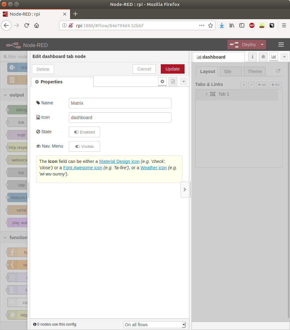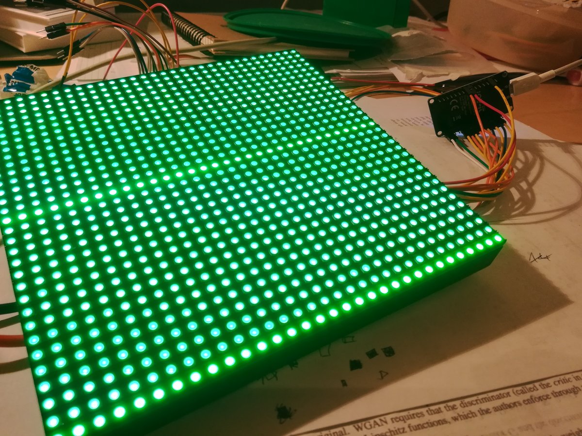 This week, I used Node-RED to setup a webserver on a RaspberryPi 3. This webserver provides a convenient user interaface to control various other devices which are connected to the Pi via the MQTT protocol. One of those devices is a 32x32 RGB LED matrix display controlled by an ESP32.