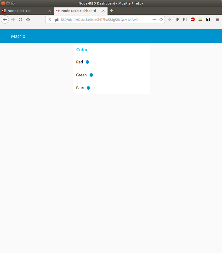 As a simple example, I created an interface that controls the RGB matrix. Each change in one of the control elements on the dashboard will send a MQTT message to the ESP32, which will update the LED matrix. Behavior like this is modeled via "flows" in Node-RED.