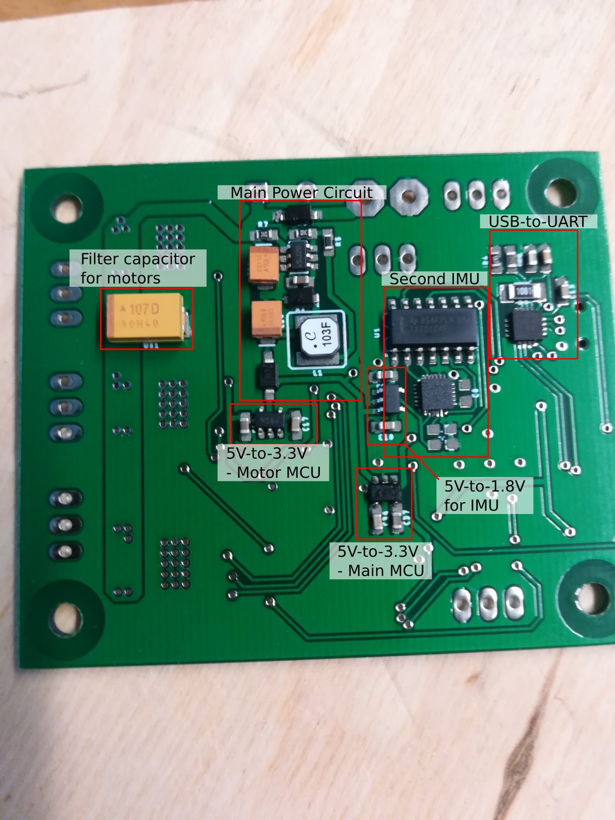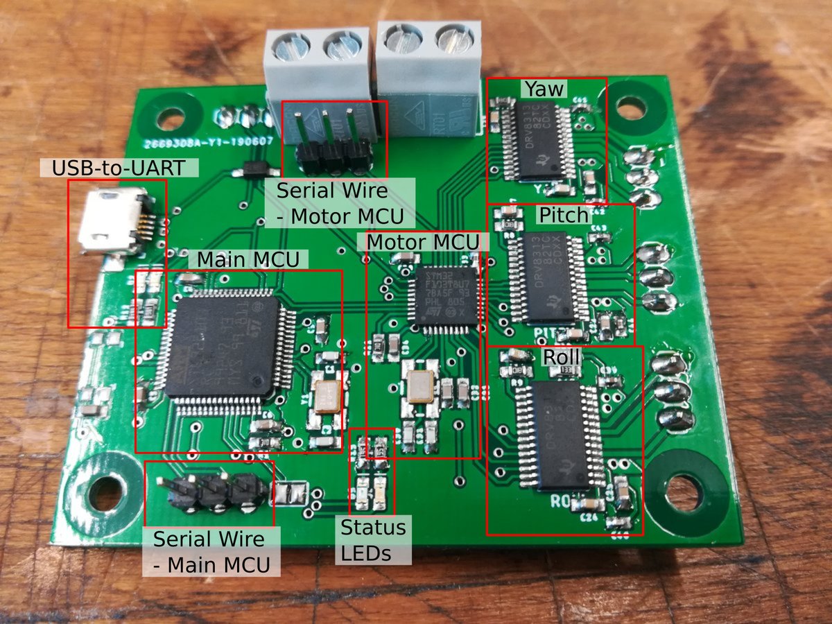 The IMU controller filters the sensor readings from the 9-axis orientation sensor, the motor controller provides PWM regulation to control the motor position, and the main controller runs the main PID control loop, coordinating the other chips. To see how it looks like when built, here's an overview of the components as laid out on the boards:
