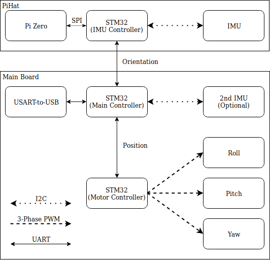 Initially, I wanted to design the gimbal in a more modular fashion, i.e. separate boards for each motor, the IMU, and the main controller; however, this proved to be too complex and I opted for a simpler design with just two boards. Nevertheless, I did keep the separation into motor control, IMU control, and main control chip, so the high-level overview of the electronics looks like this: