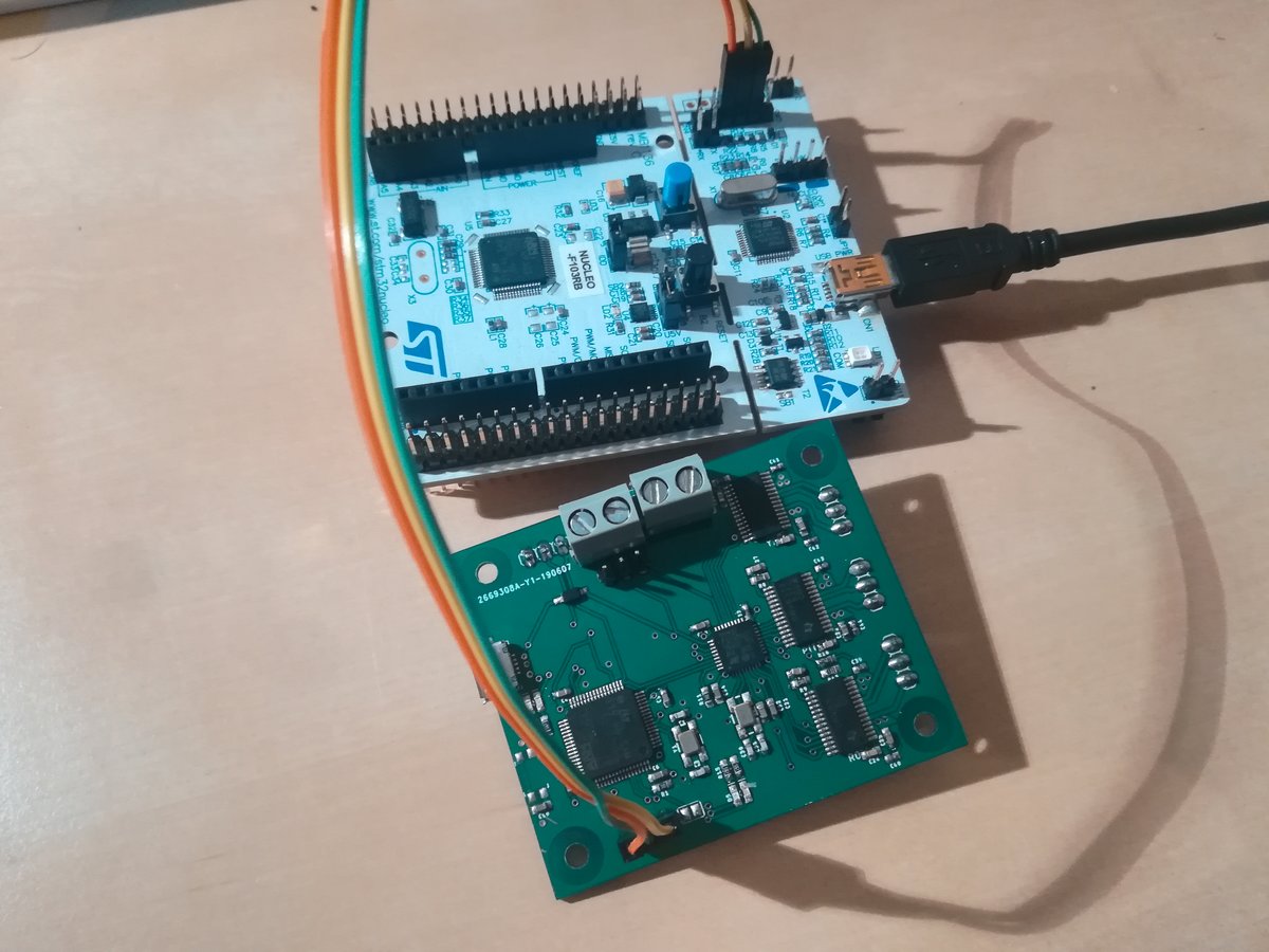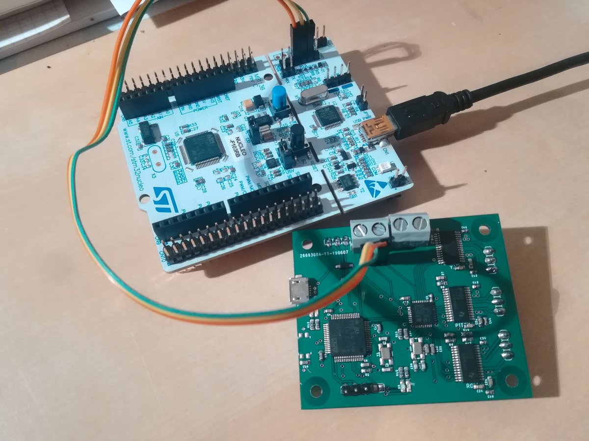 I used the ST-Link integrated in a Nucleo-64 evaluation board to program the STM32 chips, together with the STM32Cube IDE, which worked flawlessly. Just remove the two jumpers on pins CN2 and connect the programming lines of the chip to the corresponding pins on connector CN4, as depicted on the images below (and per the manual, which you should have at your side anyways). There are three projects, one for each chip. Connect the programmer to the corresponding programming header and upload the correct firmware to each micro controller. Once all chips are programmed, reset all of them by removing and reattaching the power source.