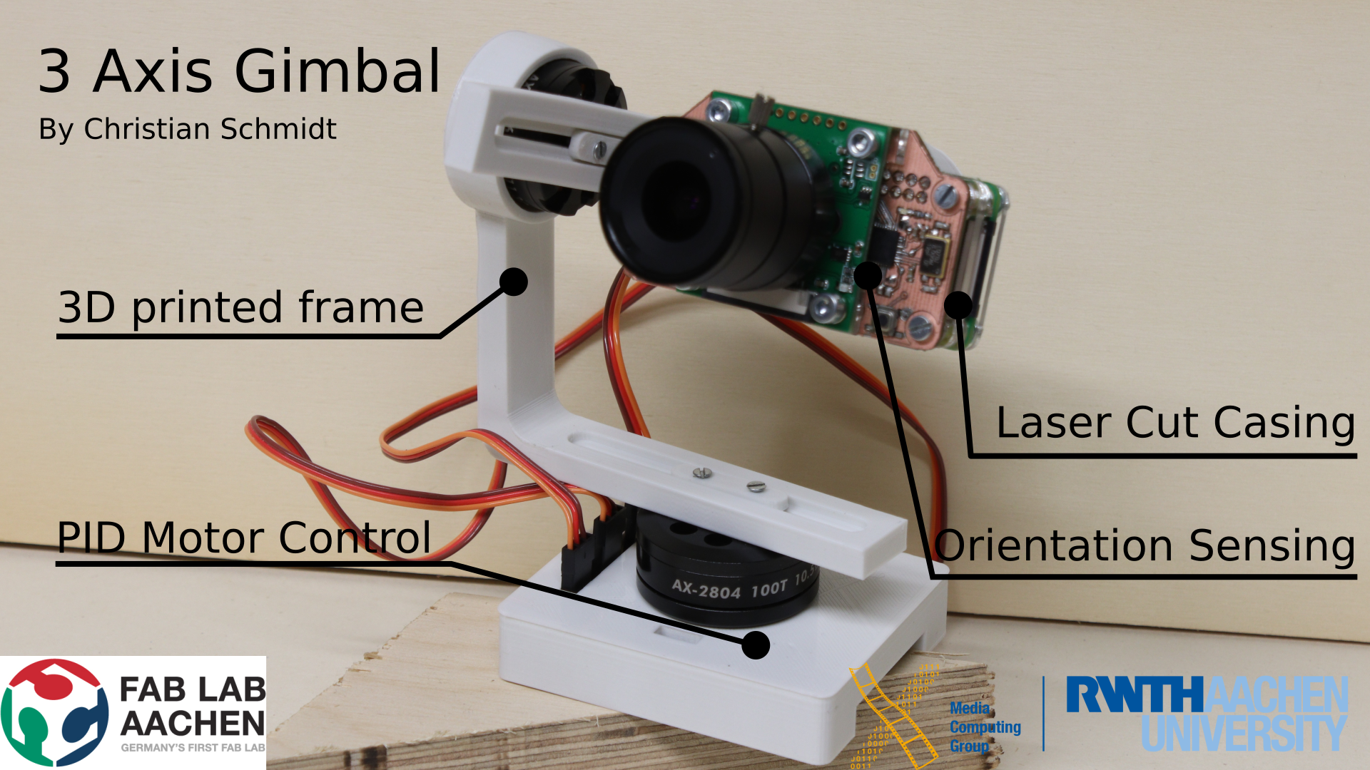 Here you can learn how to build a 3D printed three axis gimbal, using a Raspberry Pi with the corresponding PiCam as a camera. If you already own the pi and the camera, this project will cost around 70€. And probably a lot of time. With a few modifications, you can probably build it with stronger motors to use the gimbal with heavier cameras.