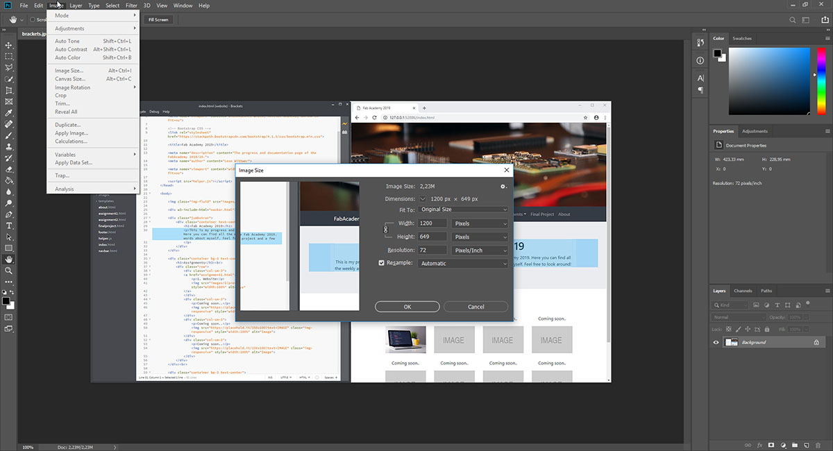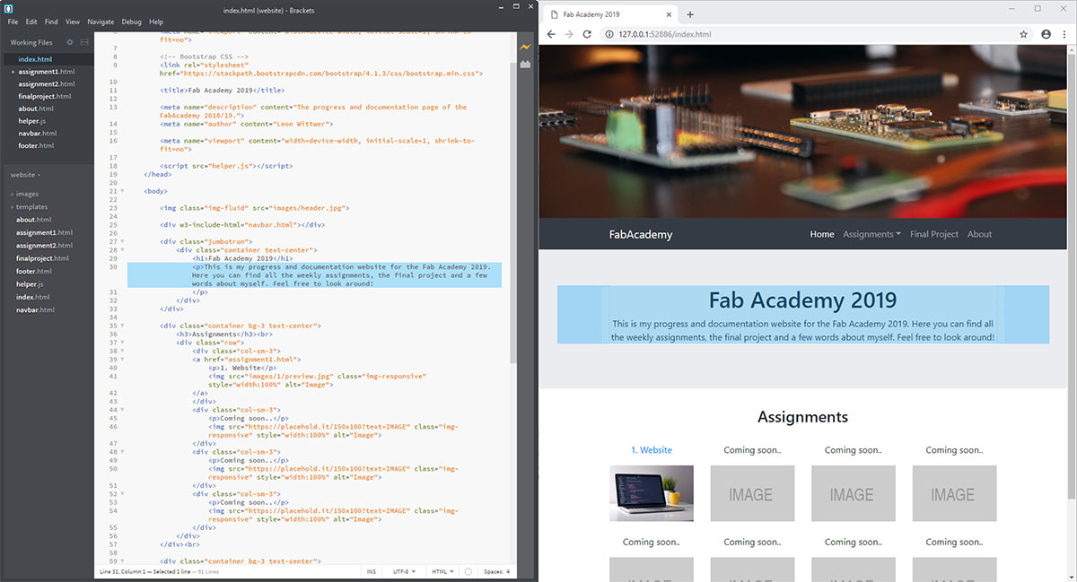 With that decided I installed Brackets and decided to use it to develop my web page because it has a live preview window which is super nice to see what you are doing and also to jump into the corresponding code by clicking the text in the preview window. This is definitely better than writing the page in a plain text editor.